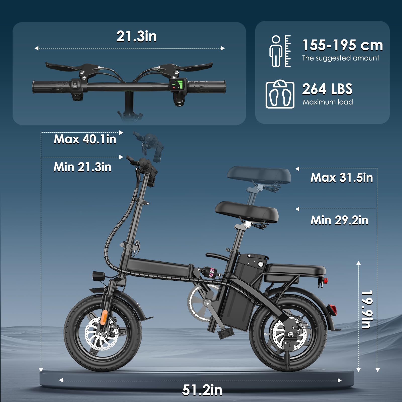- STABLE & SAFETY - The ergonomic adjustable seat and handlebar heights and the 14" puncture resistant tires are for greater durability. The LED display shows the battery information. The front and rear lights ensure safe riding at night, make your e-bike adapted to complex terrains and keep you safe.