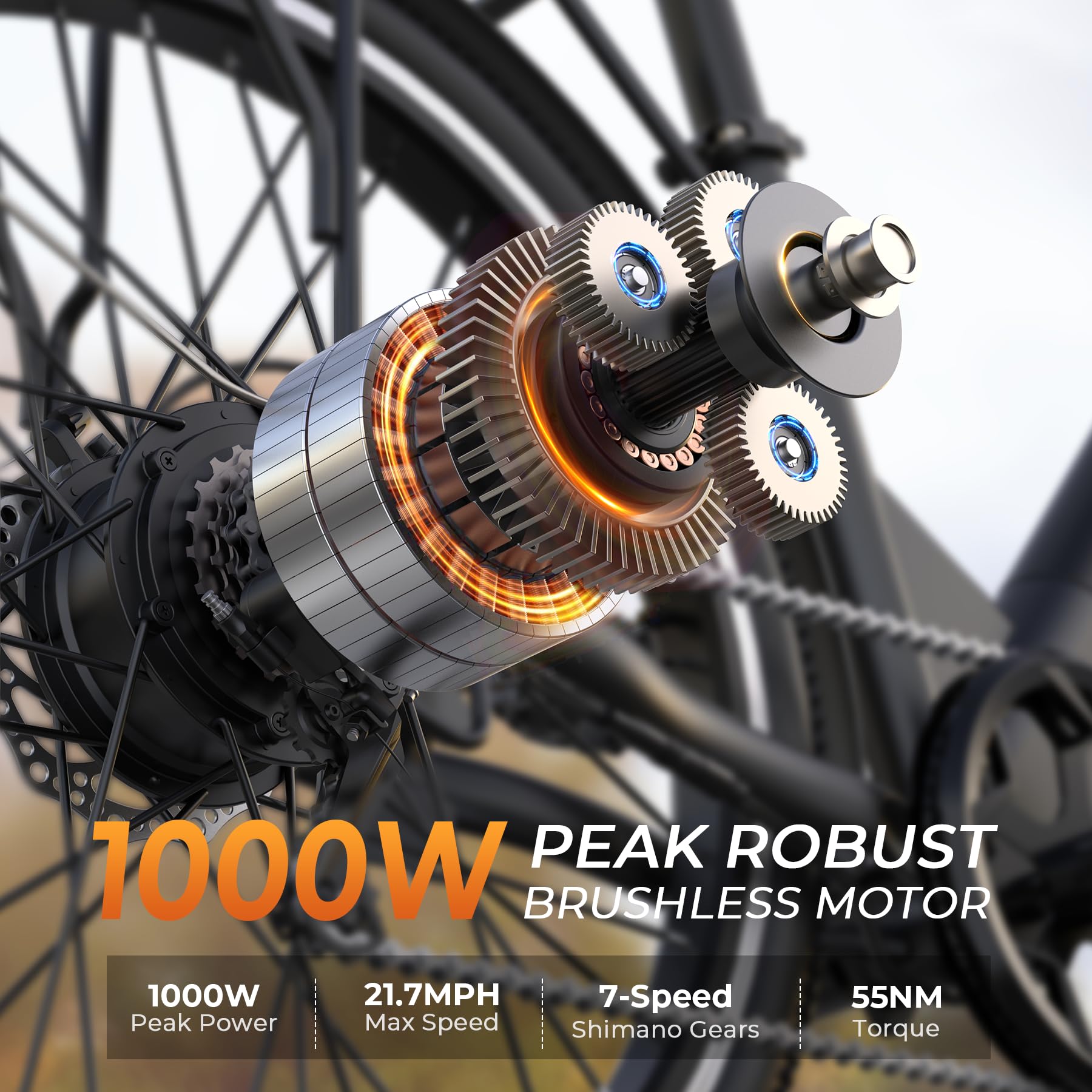 - POWERFUL 1000W PEAK BRUSHLESS MOTOR: Featuring a 500W(1000W Peak) high-torque motor, Funhang EB-C2 electric bike can reach a top speed of 21.7 mph. The powerful motor delivers a maximum torque of 55N.m for smooth acceleration and less noise. Designed for daily commute, outdoor workouts and weekend adventures, this electric bike for adults allows riders to effortlessly cross urban roads, sandy roads and off-road trails.