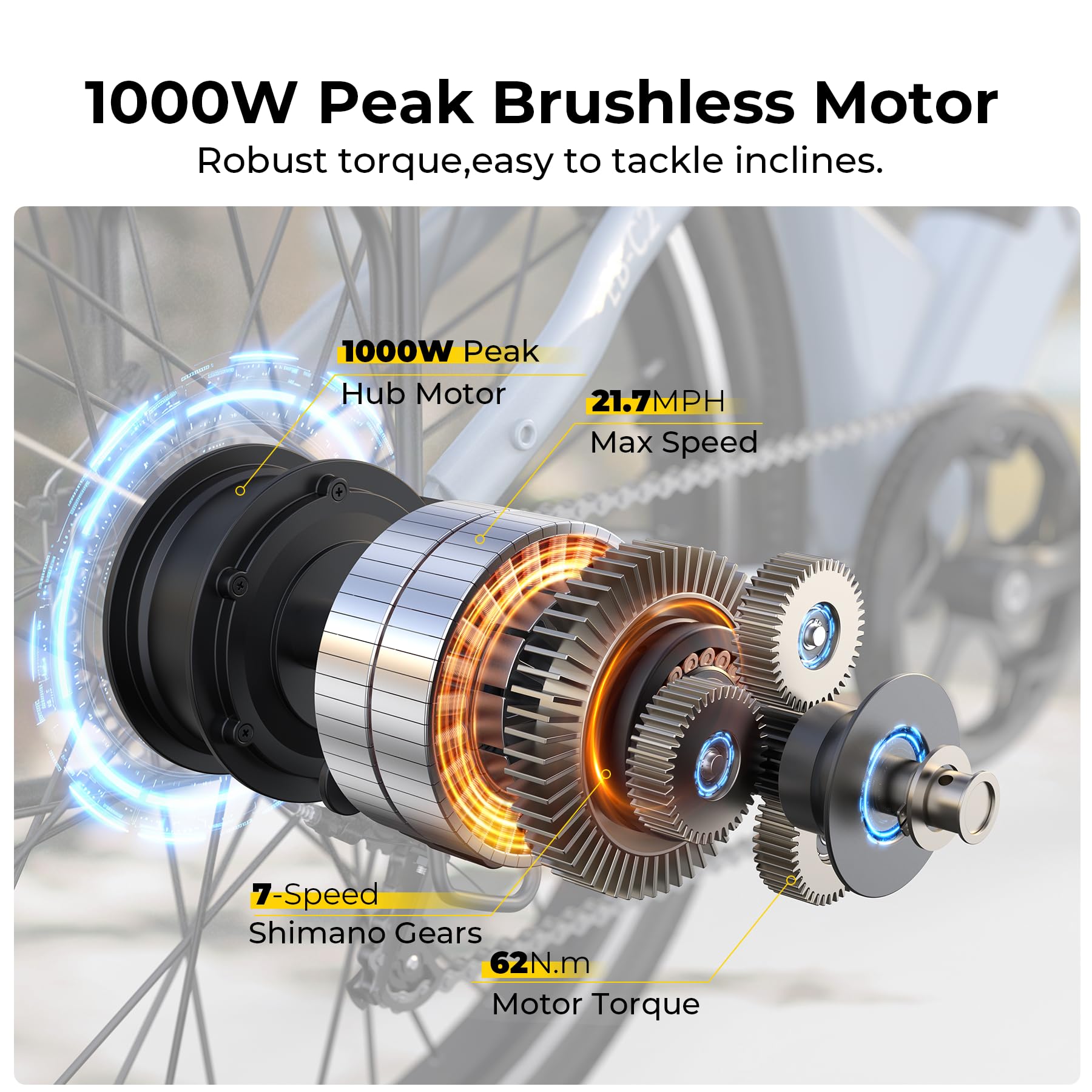 - 1000W PEAK BRUSHLESS MOTOR: Funhang electric bike is powered by a robust 500W (1000W peak) high-speed brushless motor, boasting a top speed of 21.7MPH and maximum torque of 62N.m. Its impressive power and performance allow you to conquer steep inclines and long-distance adventures with ease. Whether you're commuting to work, enjoying a workout or exploring new routes, this electric bike for adults offers you a smooth and enjoyable experience.