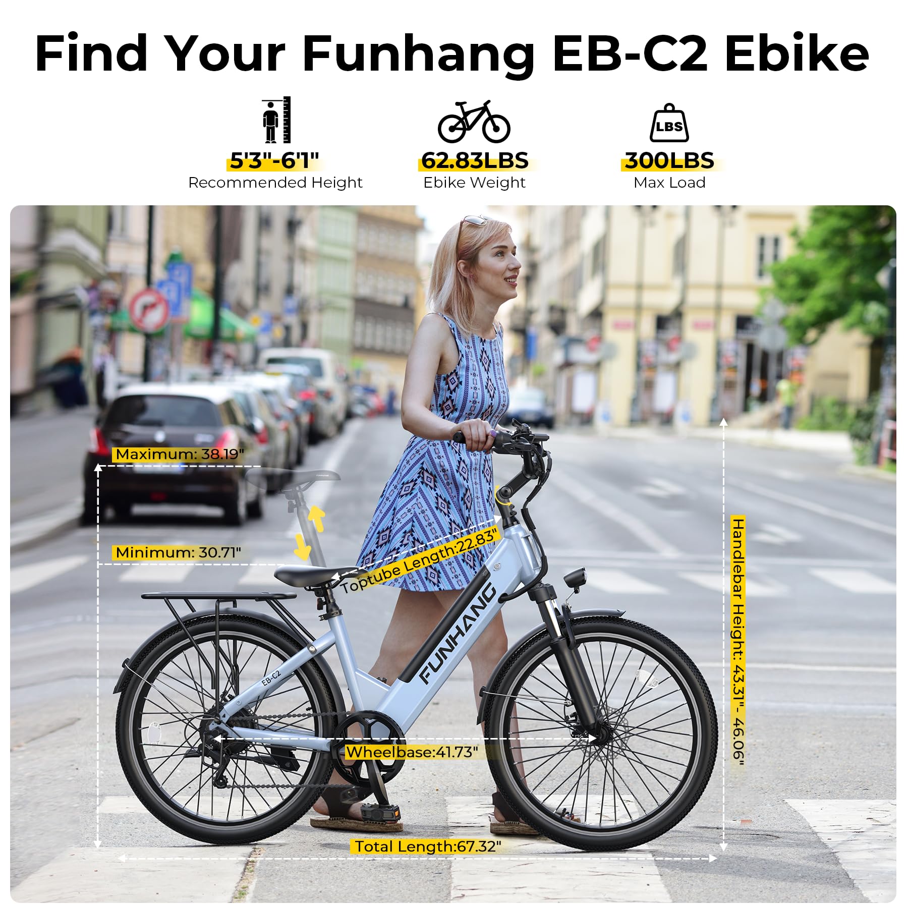 - EASY ASSEMBLY AND RELIABLE SUPPORT: Funhang EB-C2 electric bike is almost 85% pre-assembled and comes with instructions and tools. You can follow the assembly video on our page or user manual to complete the rest. Please inflate both tires for the first ride. This ebike weight 62.83 lbs, max load 300 lbs, recommended height 5'3"-6'1". 1-year warranty and lifetime tech support are covered. If you have any questions, please don't hesitate to contact us. We will respond to you within 24 hours.