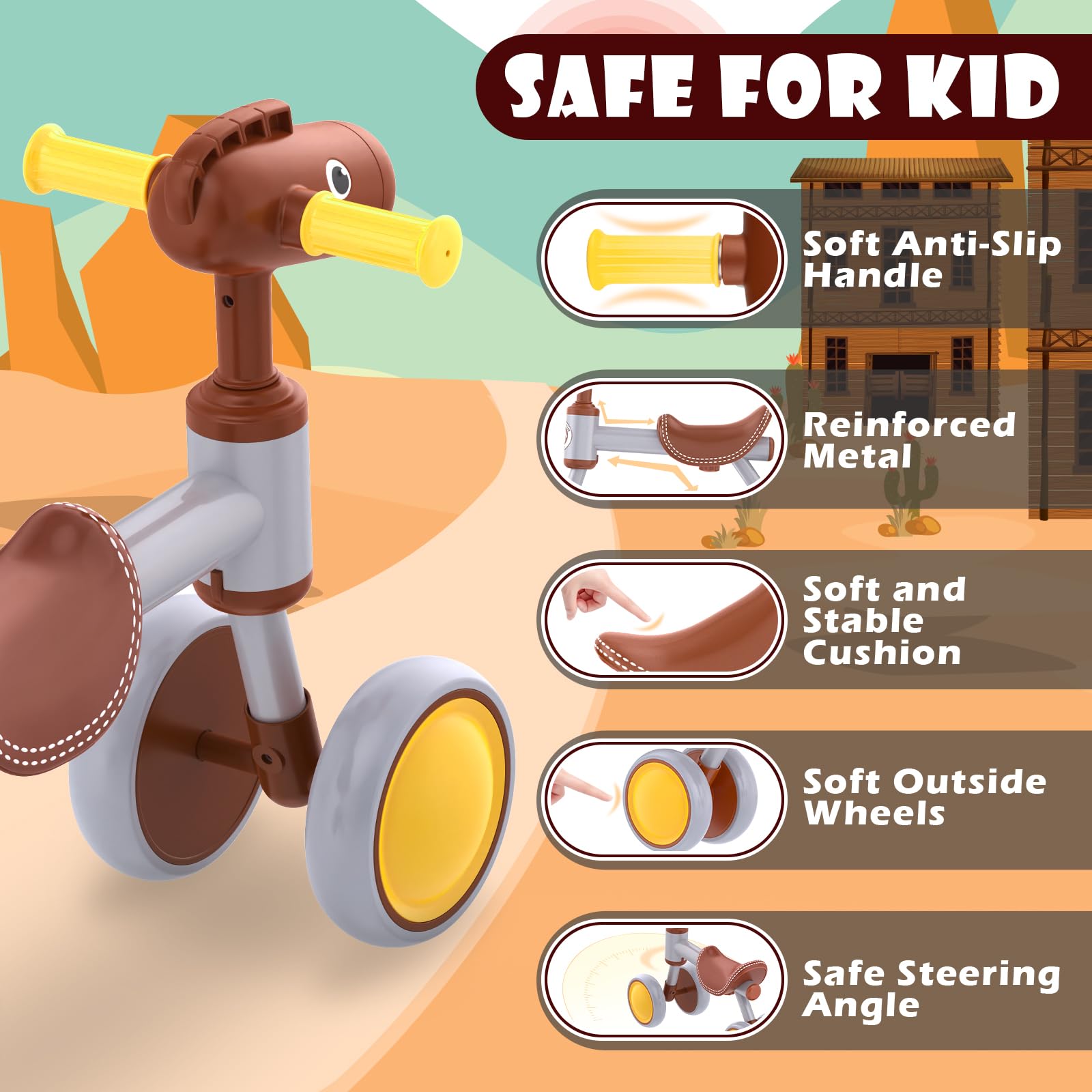 - [Sturdy & Comfortable] The toddler balance bike is equipped with a sturdy carbon steel frame, soft non-slip EVA handles and a padded seat made of PU material, 4 high-density EVA soft silent wheels, non-slip, wear-resistant, will not damage the floor, baby can ride indoors or outdoors. Provide your baby with a stable and comfortable riding environment, your child will enjoy the fun of riding every day.