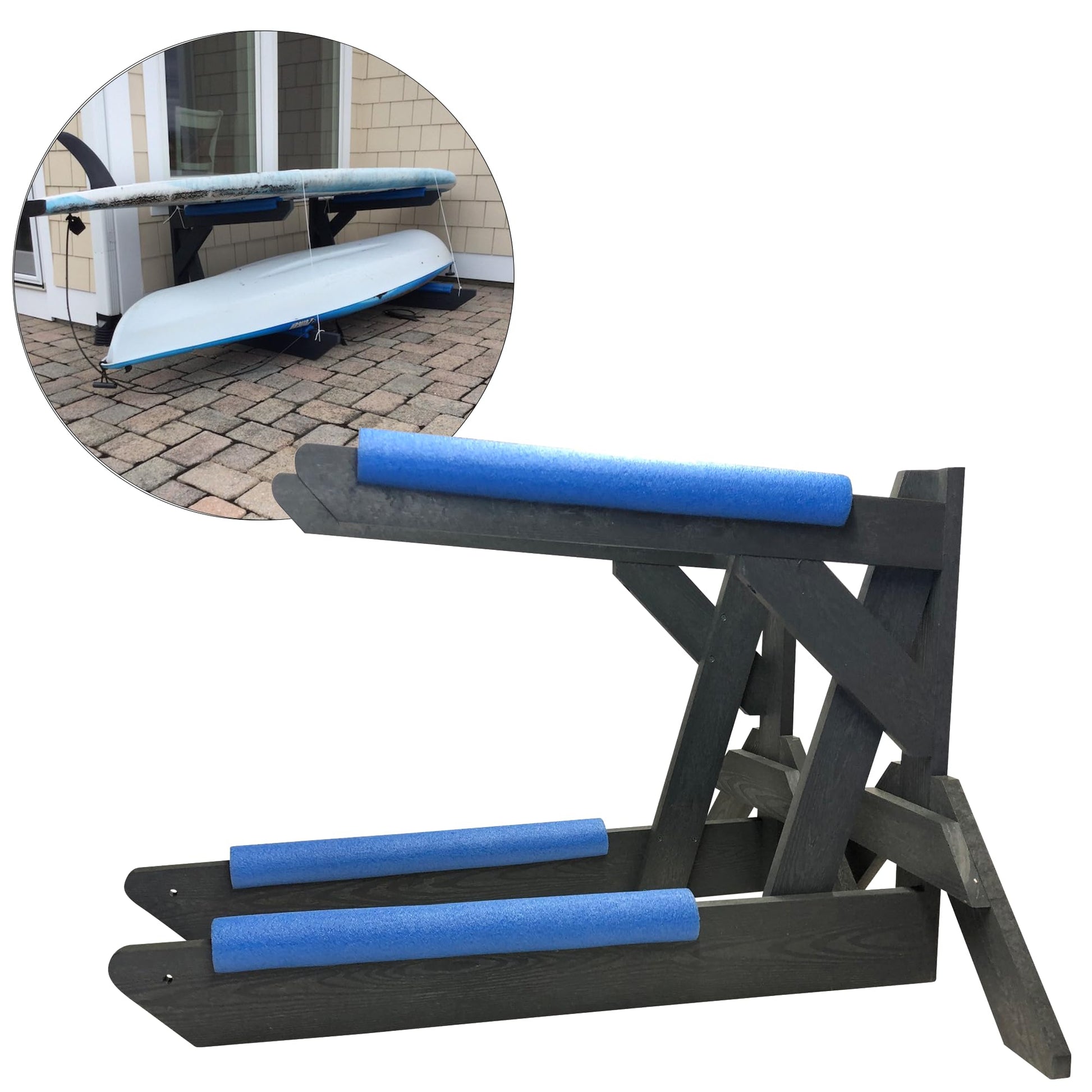 - 【Anywhere Storage For Kayaks, SUPs And Canoes】Looking for a versatile storage solution for your kayaks, canoes, or SUPs? The ReRackiT kayak stand is perfect for both indoor and outdoor use! Whether it’s on your deck, dock, garage, or patio stones, just place your ReRackiT kayak racks on a solid surface to keep your watercraft safe and secure. Protect your investment by getting your gear off the ground. If you need an efficient indoor or outdoor kayak storage rack, canoe storage rack or paddle board rack, the ReRackiT poly kayak storage rack is the answer you've been looking for!