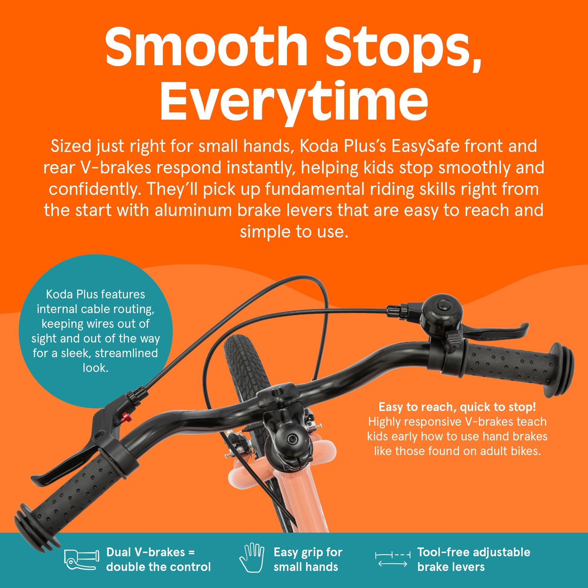 - SMART BRAKE DESIGN: Kid-sized brake levers make stopping safe and simple. These adjustable V-brakes teach proper braking habits early, preparing them for bigger bikes down the road