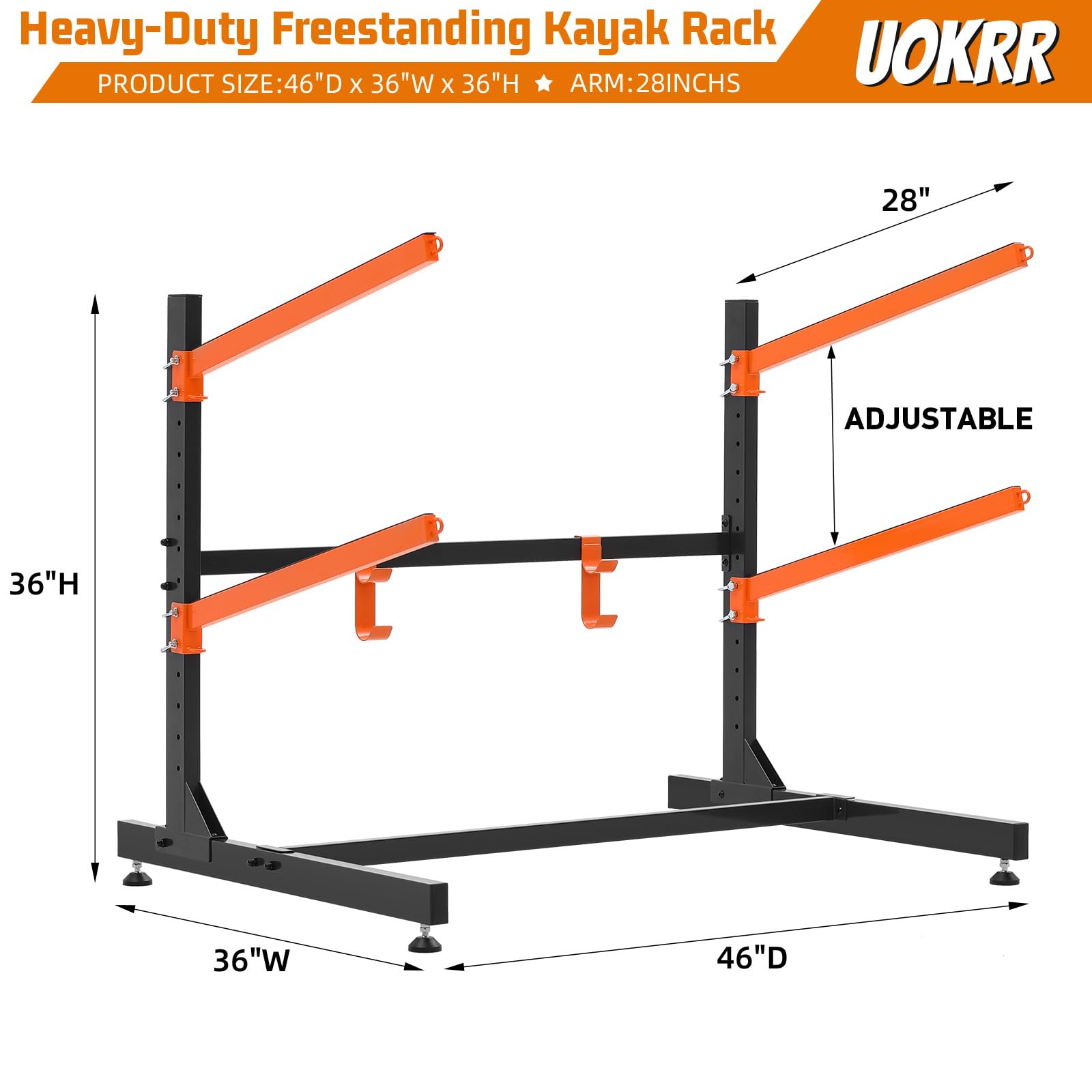 - 【Freestanding Kayak Stand】Assembled Kayak rack measures 36" H x 46" W x 36" D, the freestanding kayak storage effectively uses your outdoor garage dock backyard shed or even porch space, keeping your kayaks organized, each tier of the kayak holder is equipped with a built-in metal ring that secures a cable lock or elastic cord