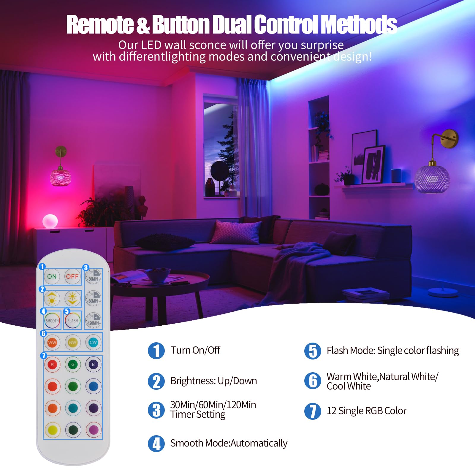 - 【Temperature Dimmable & 12 RGB Colors】Modern Wall sconces decor can adjust the brightness, the bulb can be 3000K warm light-6500K white light adjustment and has 12 RGB lighting colors, 2 RGB lighting modes:Smoothing and Flashing, you can create the color effect you want.