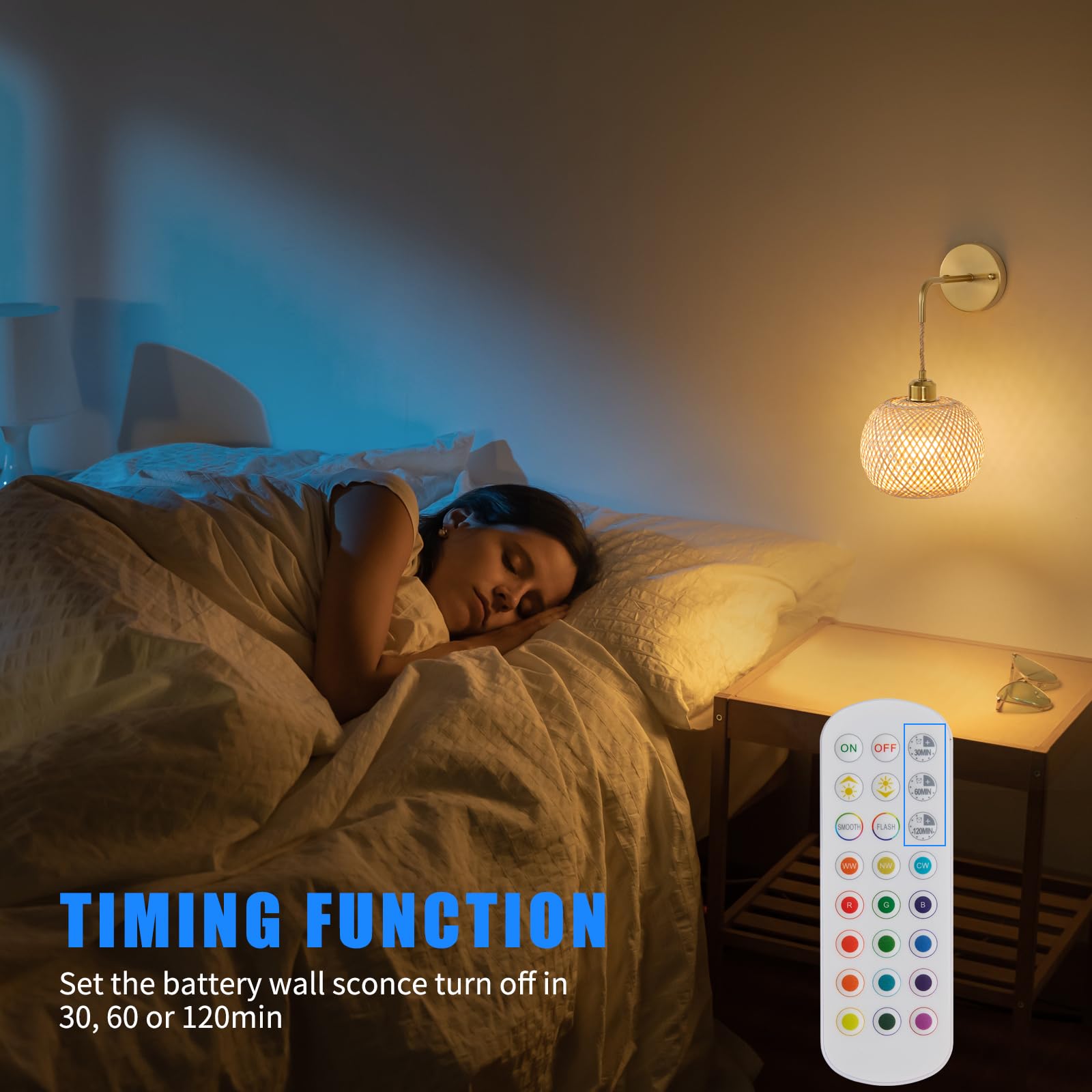 - 【Wireless Remote Control & Timer】This bedroom wall sconce adopts wireless design, it is equipped with remote control, you can realize intelligent control, vintage wall lamp also has timing function, you can set 30min/1h/2h timing in advance, accompany you to sleep peacefully.