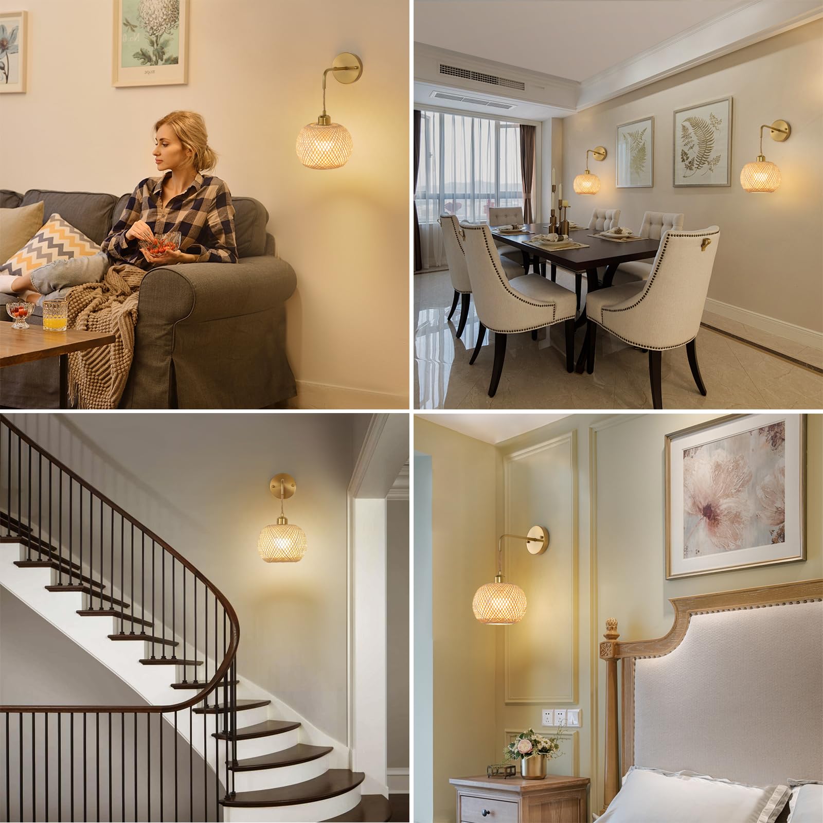 - 【Farmhouse Rattan Wall Sconces】These wall lamps are made of natural materials, by hand craftsmen, not machine products, each wall lamp shape is unique. Base: 4.72"*0.98", shade: 7.87"*5.9", overall height: 18.9". The gold metal bracket and base are used to prevent corrosion. The wireless wall sconces are designed in Boho style, with elegant lighting patterns presented under the lights.(Note: Please keep it dry for use).