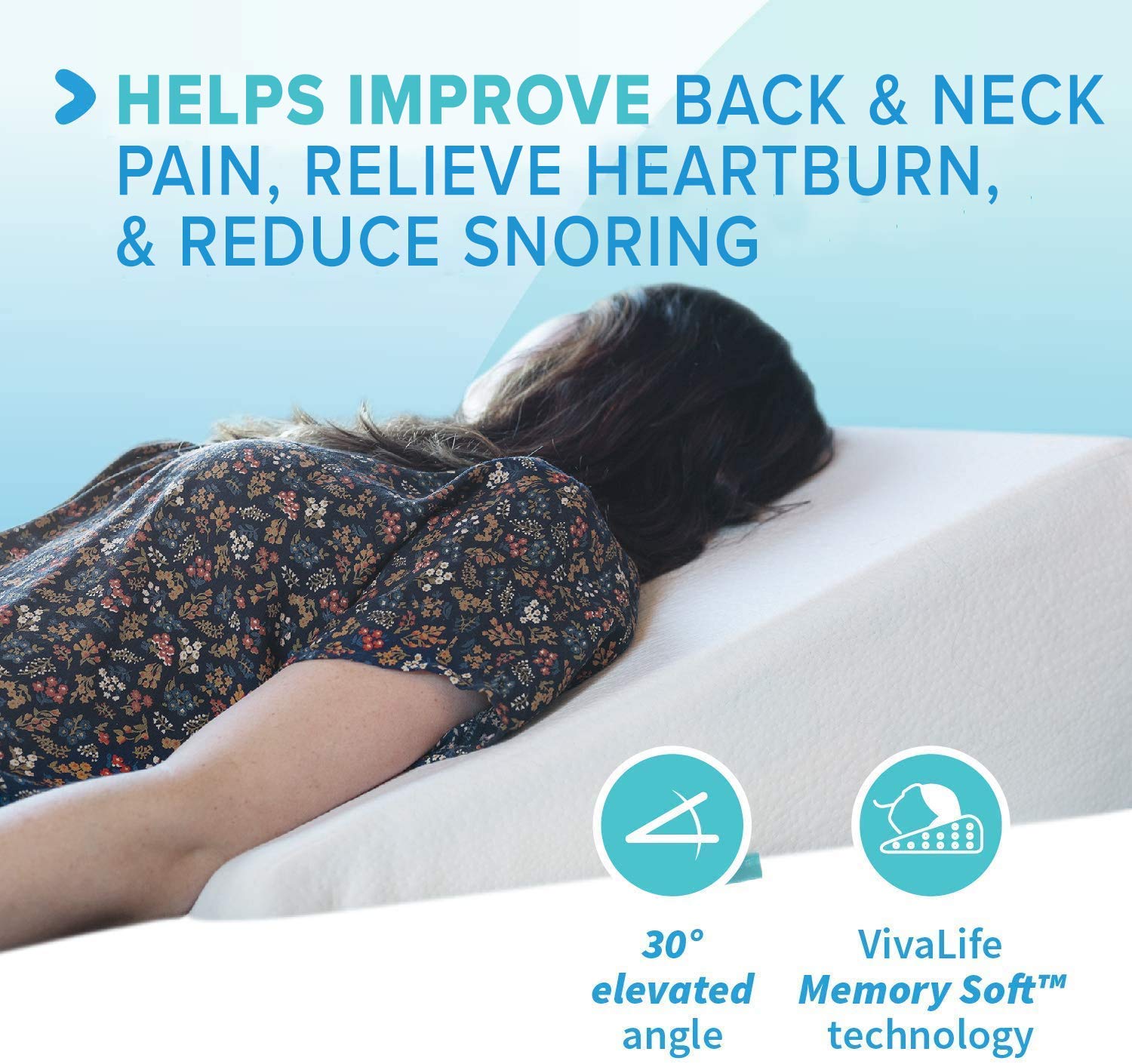 - IMPROVE BACK & NECK PAIN, ACID REFLUX & MORE: Back and neck pain? Acid Reflux? Terrible sleeping patterns? Help relieve unwanted back and neck pain by improving your shoulder, spine alignment and overall sleeping posture with Vivalife’s cooling bed wedge pillow. With the 30° elevated angle and VivaLife Memory Soft technology, the bed wedge cushion helps relieve Acid Reflux, Heartburn, Gerd, Digestion issues, Post Nasal Drip, Sciatica, Snoring, Hiatal Hernia, Allergies, Coughing Respiratory Dif