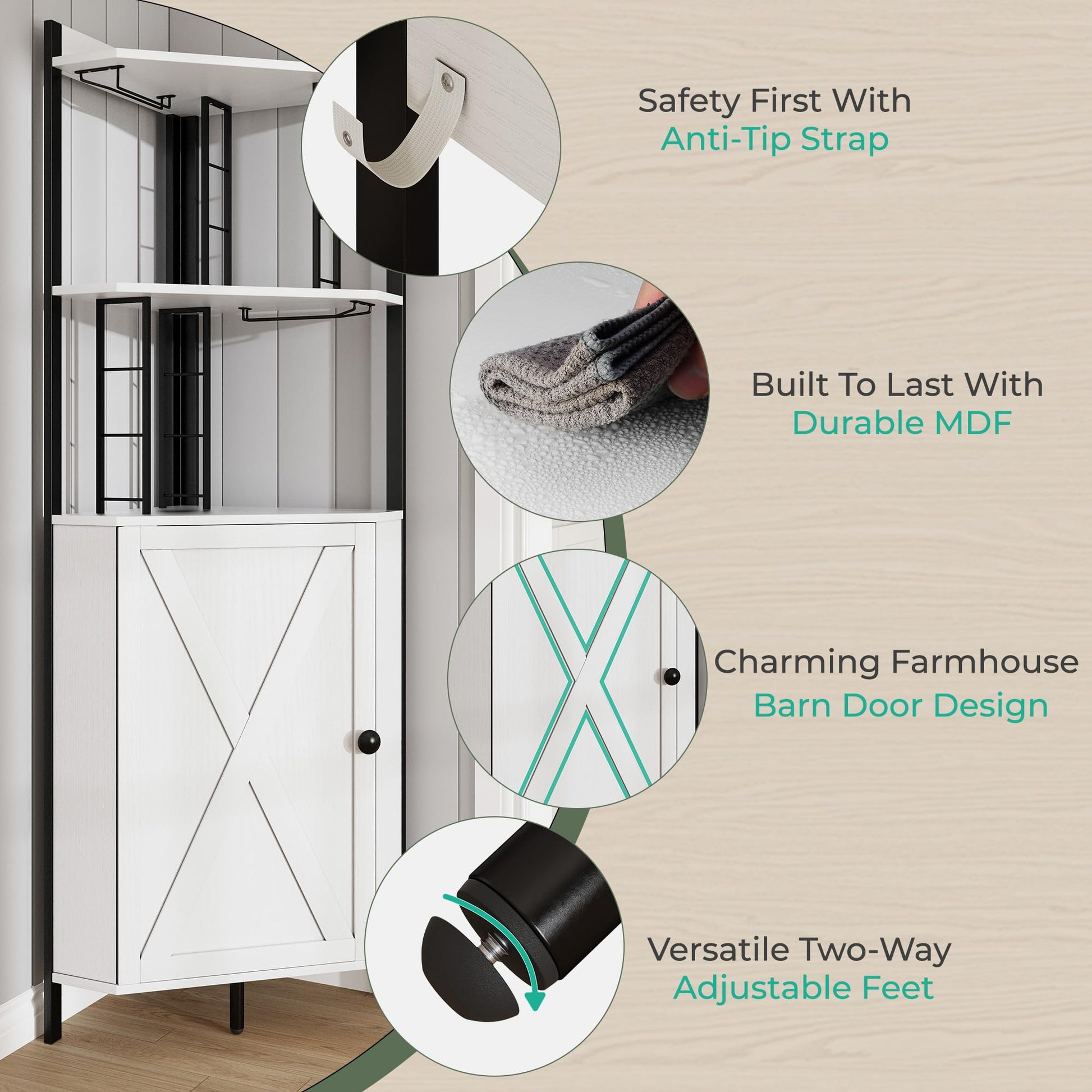 - [Perfect for Corners] Turn unused corners into functional highlights with this 5-tier corner bar cabinet. Designed to maximize space and elevate your interior, it features a chic farmhouse look complete with classic barn-style doors and vintage metal hardware. It’s the perfect blend of rustic charm and practical storage.