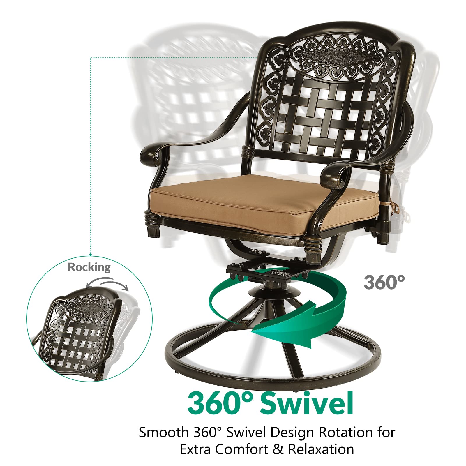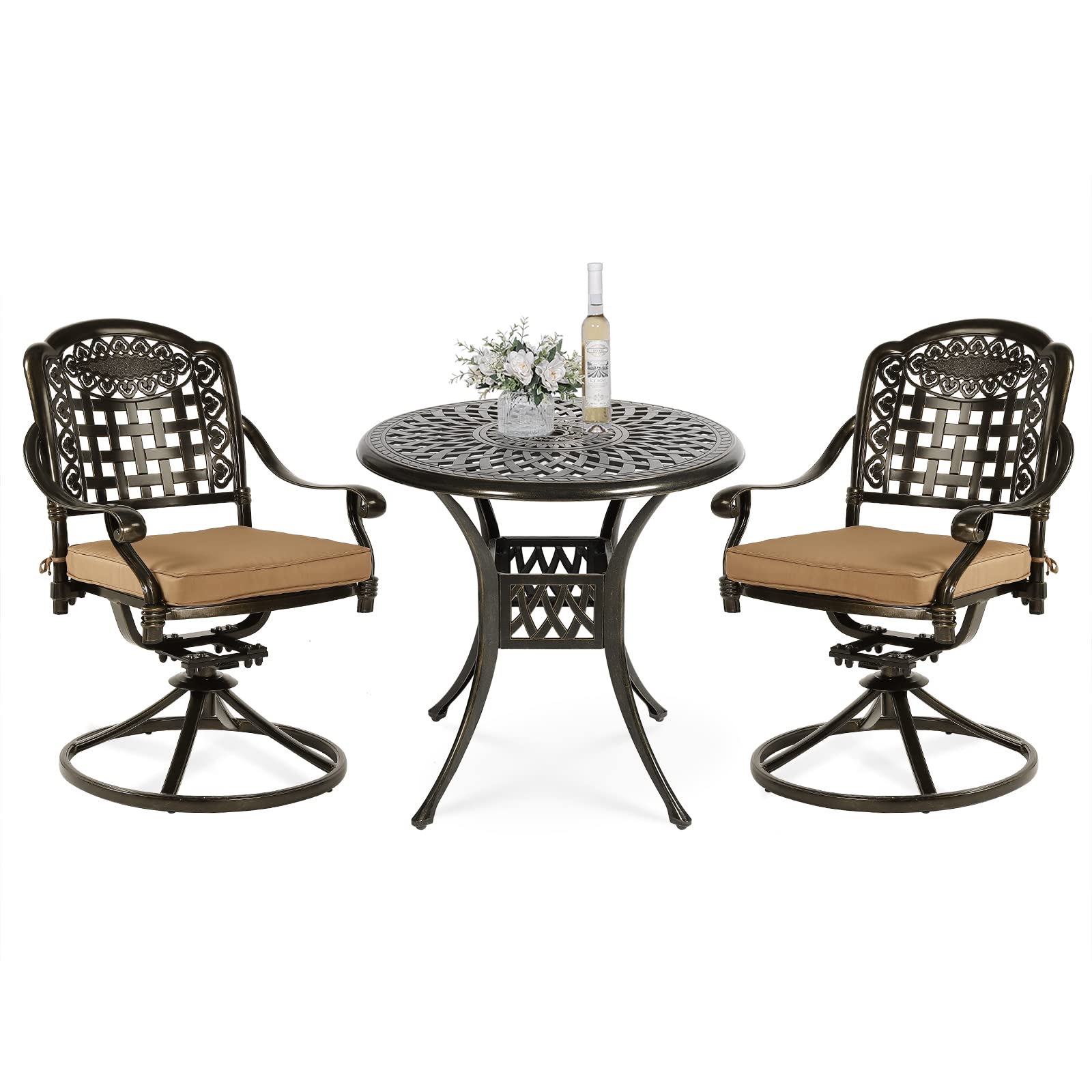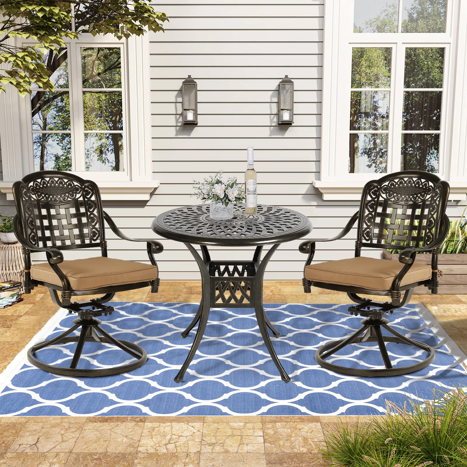 - 【STYLISH APPEARANCE】 - This 3-Piece Dining Set includes 2 swivel dining chairs and 31" round cast table. Elegant cast accents scroll across the chairs and table top, adding a level of sophistication and craftsmanship to the collection. Perfect addition to your patio, yard, deck, or porch.