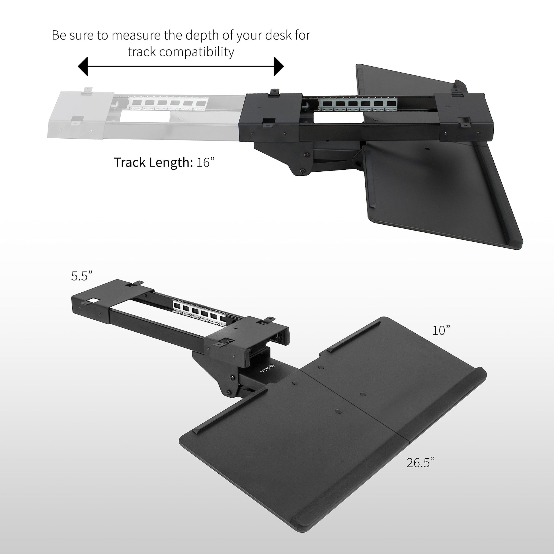 - Deluxe Universal 26.5" x 10" Tray: Weighs 12.7 lbs and fits most keyboards and mice. The keyboard slides forwards and backwards on a 16" track. (Be sure to measure the underside of your desk to make sure the 16" track fits!)