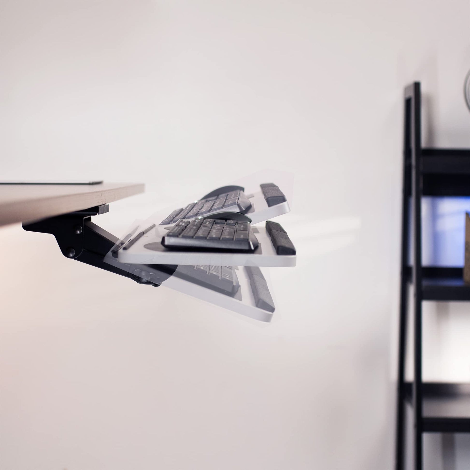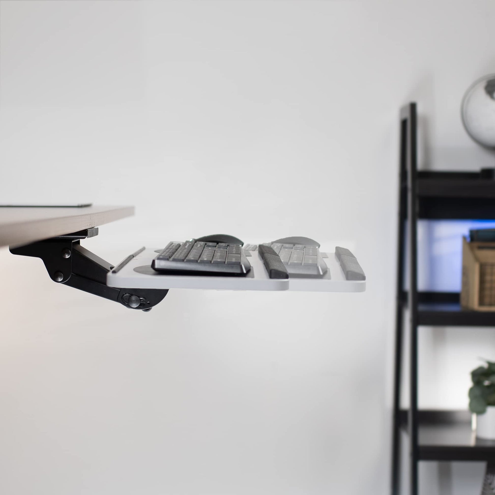 - Ergonomic Keyboard and Mouse Tray - Attaches to the underside of your desk for a space-saving setup. The keyboard slides forward and backward on an 18" track (Be sure to measure the underside of your desk to make sure the 18" track will fit!).