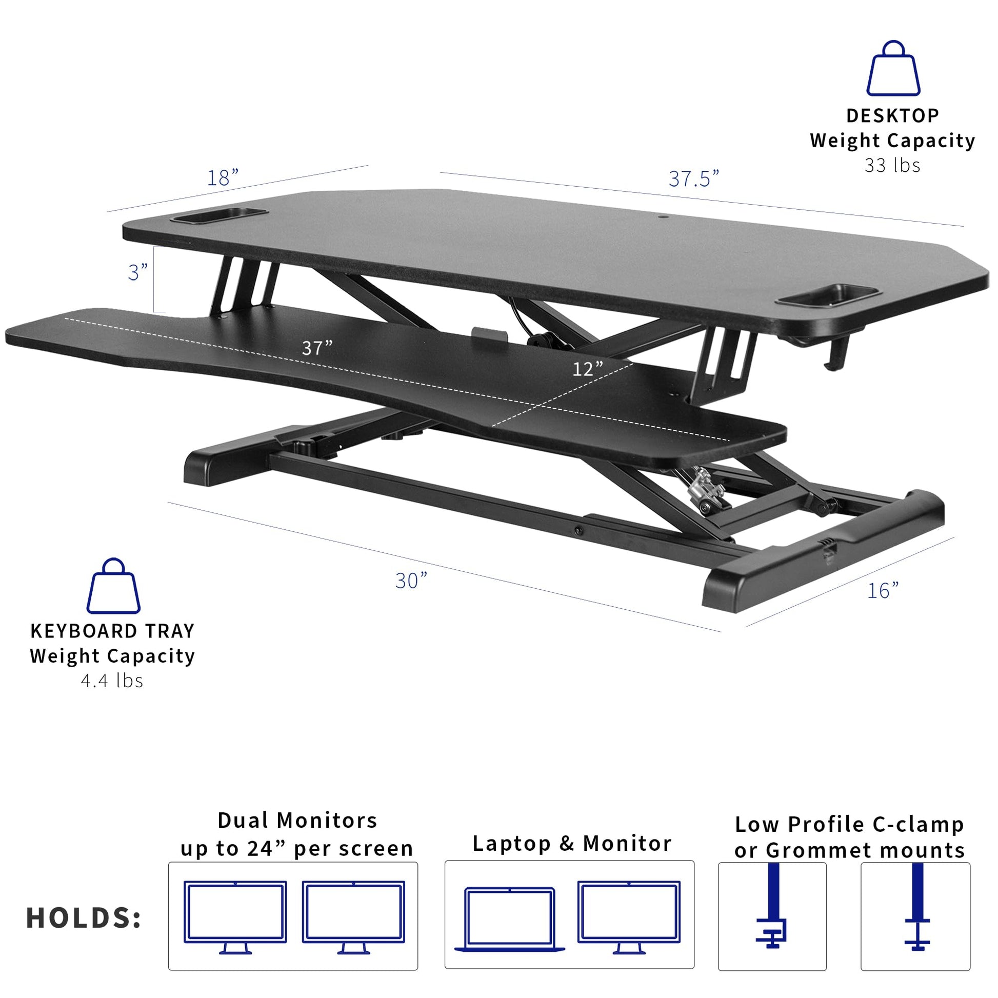 - Spacious 38" Surface: The large top measuring 37.5” x 18” is ideal for corner desks and allows ample room for dual monitor/laptop setups and office supplies. The 37” x 12” keyboard tray raises in sync with the top surface to create an ideal workspace