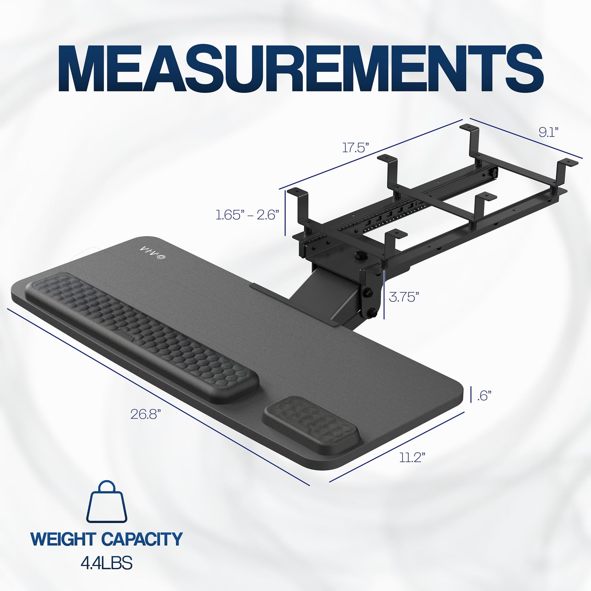- Deluxe Universal Tray: The 26.8” x 11.2” surface fits most standard-size keyboards and mice on the market. Minimum recommended desktop thickness is 0.7”