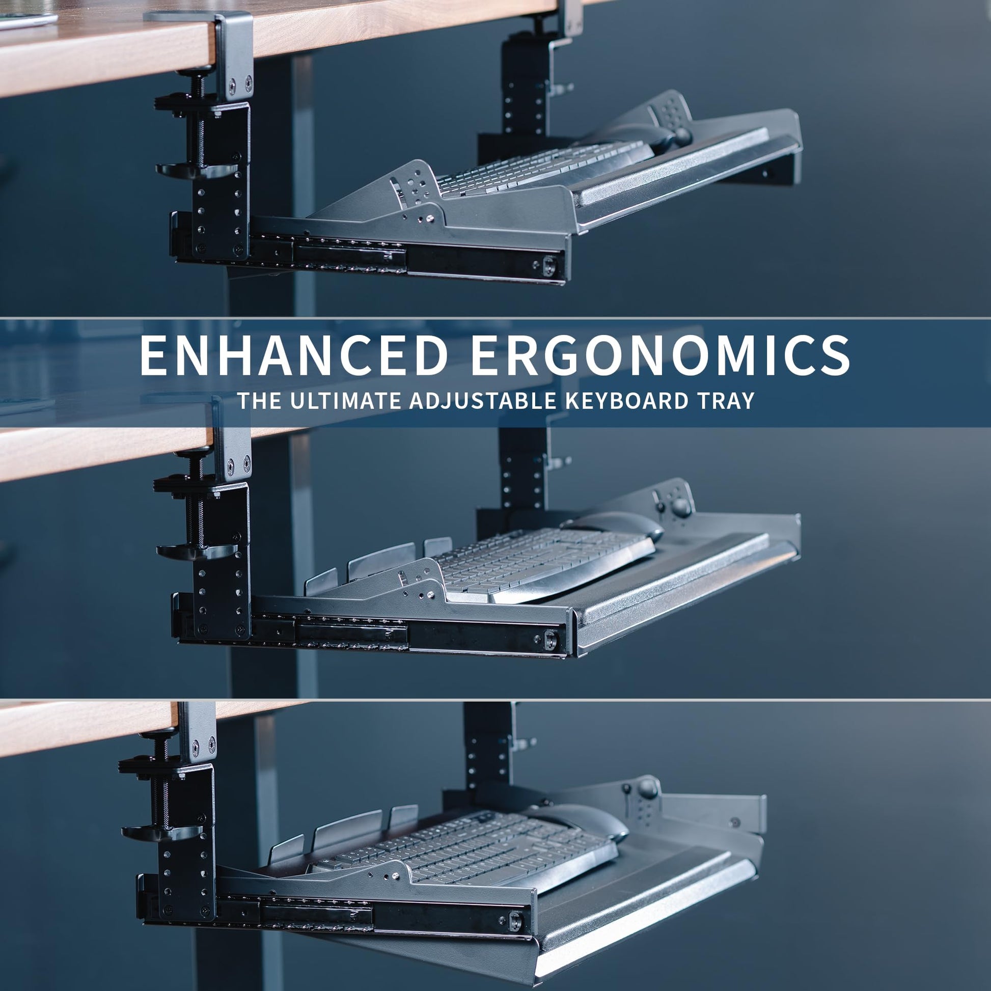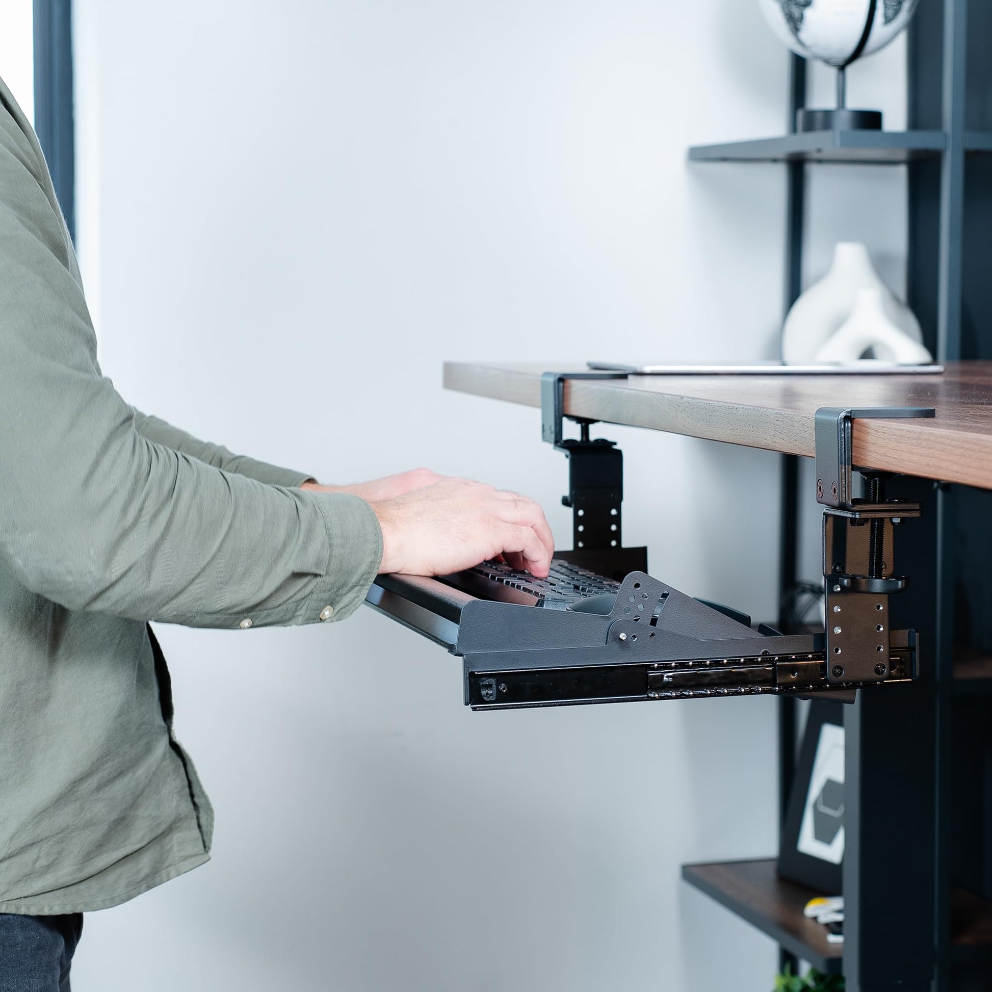 - Save Desk Space with Premium Tray: This 26.8" (34" including clamps) x 11" under-desk keyboard tray holds your keyboard, mouse, and other small accessories below the desktop for added work space and holds up to 11 lbs