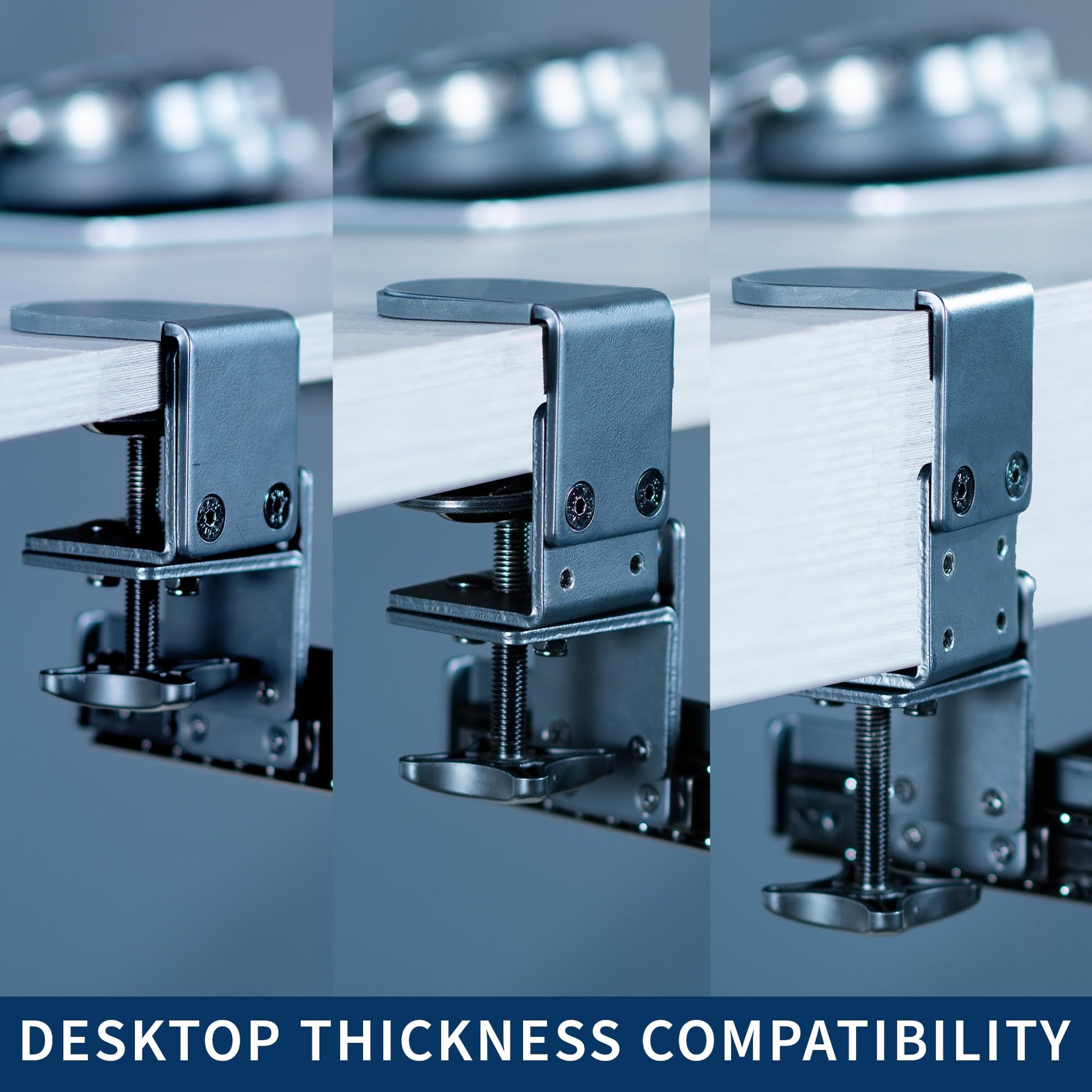 - Adjusting Brackets and Swivel Clamps: Attach to a desk without damaging the top (3.4” maximum thickness). Clamps rotate 90° independently for custom placement and tighten for a solid hold. Height adjustable side brackets allow desired clearance under desk