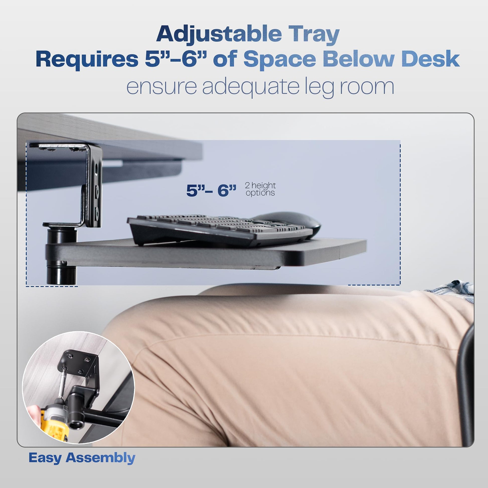 - Strong Build: This tray was constructed for durability and long use. It holds up to 11 lbs, and its design allows enough room for small to standard-size keyboard trays