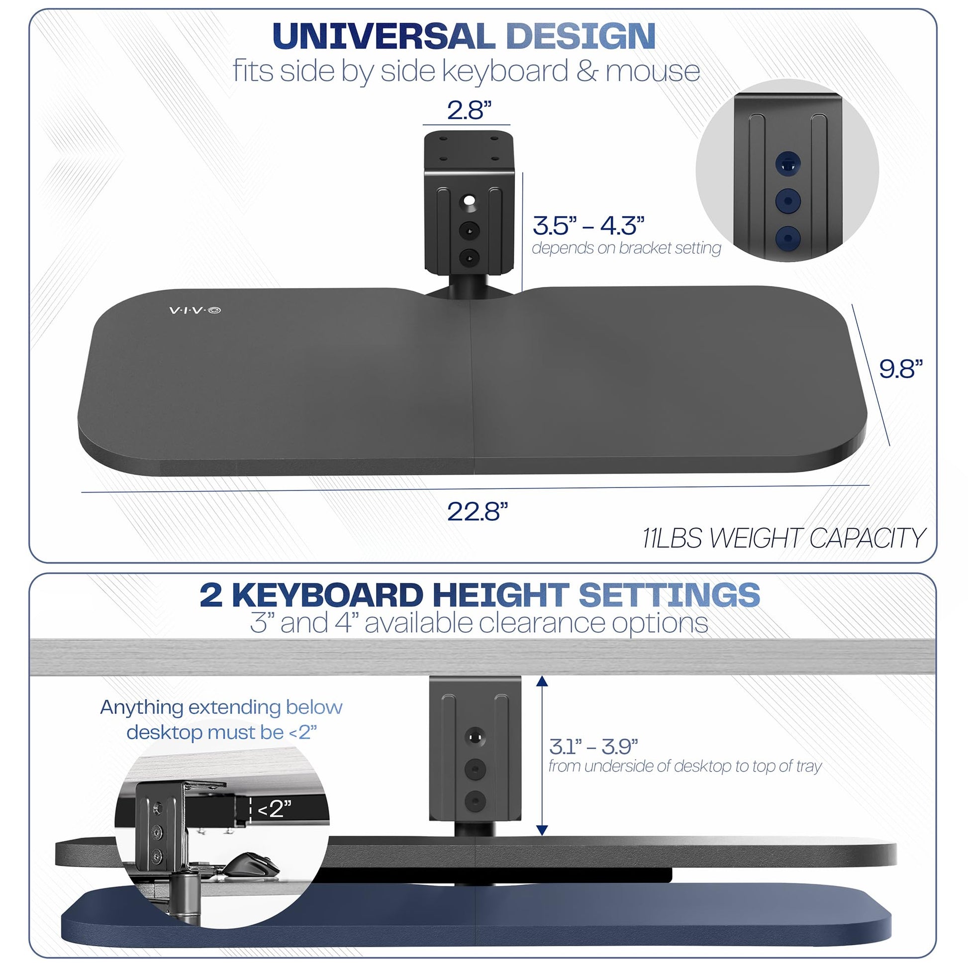 - Save Desk Space: This 22.8” x 9.8” keyboard tray installs to the underside of a sturdy desktop (at least 0.75" thick), holding your keyboard and mouse conveniently below the desktop for ergonomic typing angles and added workspace
