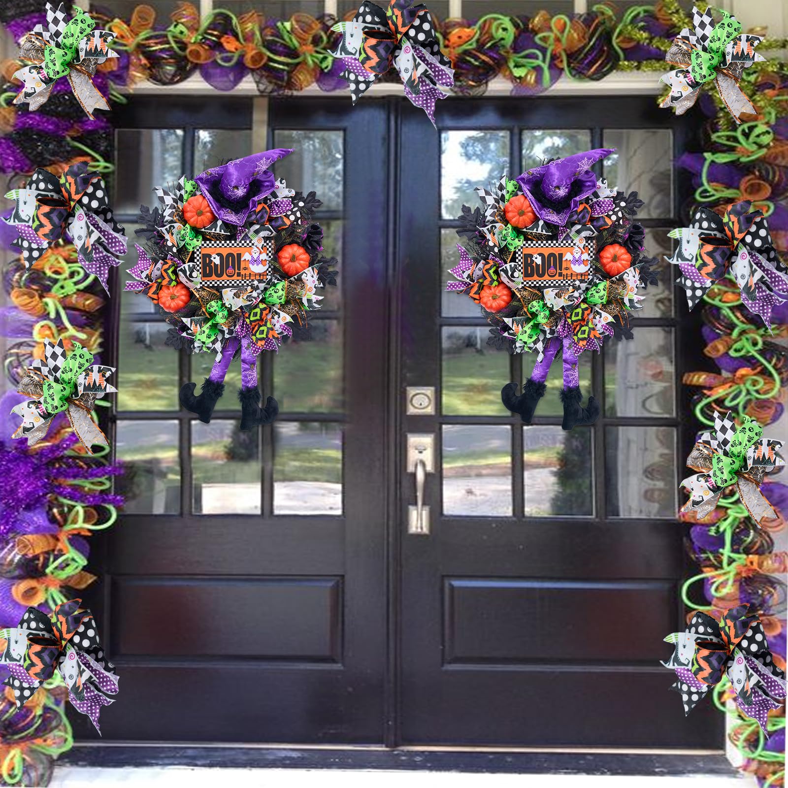 Vofuly Wreath for Front Door,20inch mesh Wreath,Pumkin & Witch Wreath with Legs,Fun Porch Decor,Decoration,Whimsical Halloween,Purple Green Orange (V23HL001)