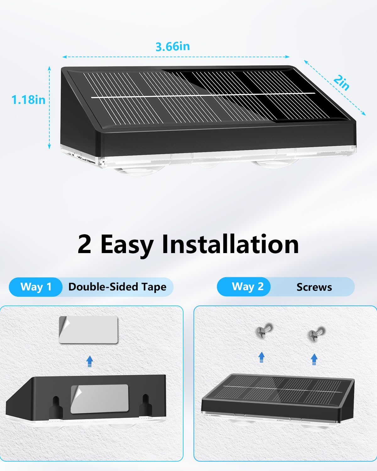 - 【Simple Installation】Solar fence lights are very easy to install, no wiring required. Just use two screws or double-sided tape (included) to quickly fix the outdoor solar fence lights on any flat surface such as fences, walls, steps, etc.