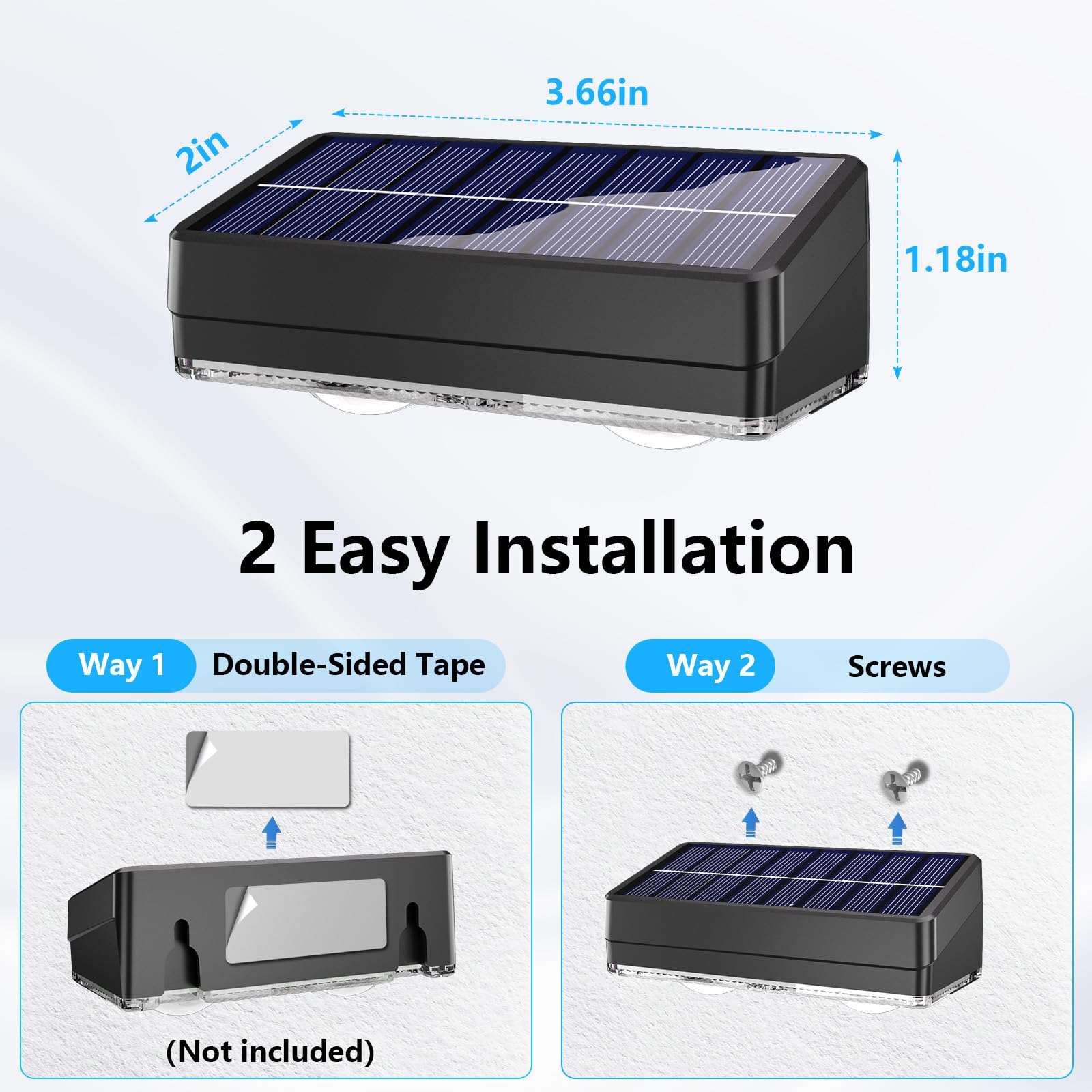 - 【Simple Installation】Solar fence lights are very easy to install, no wiring required. Just use two screws or double-sided tape to quickly fix the outdoor solar fence lights on any flat surface such as fences, walls, steps, etc.