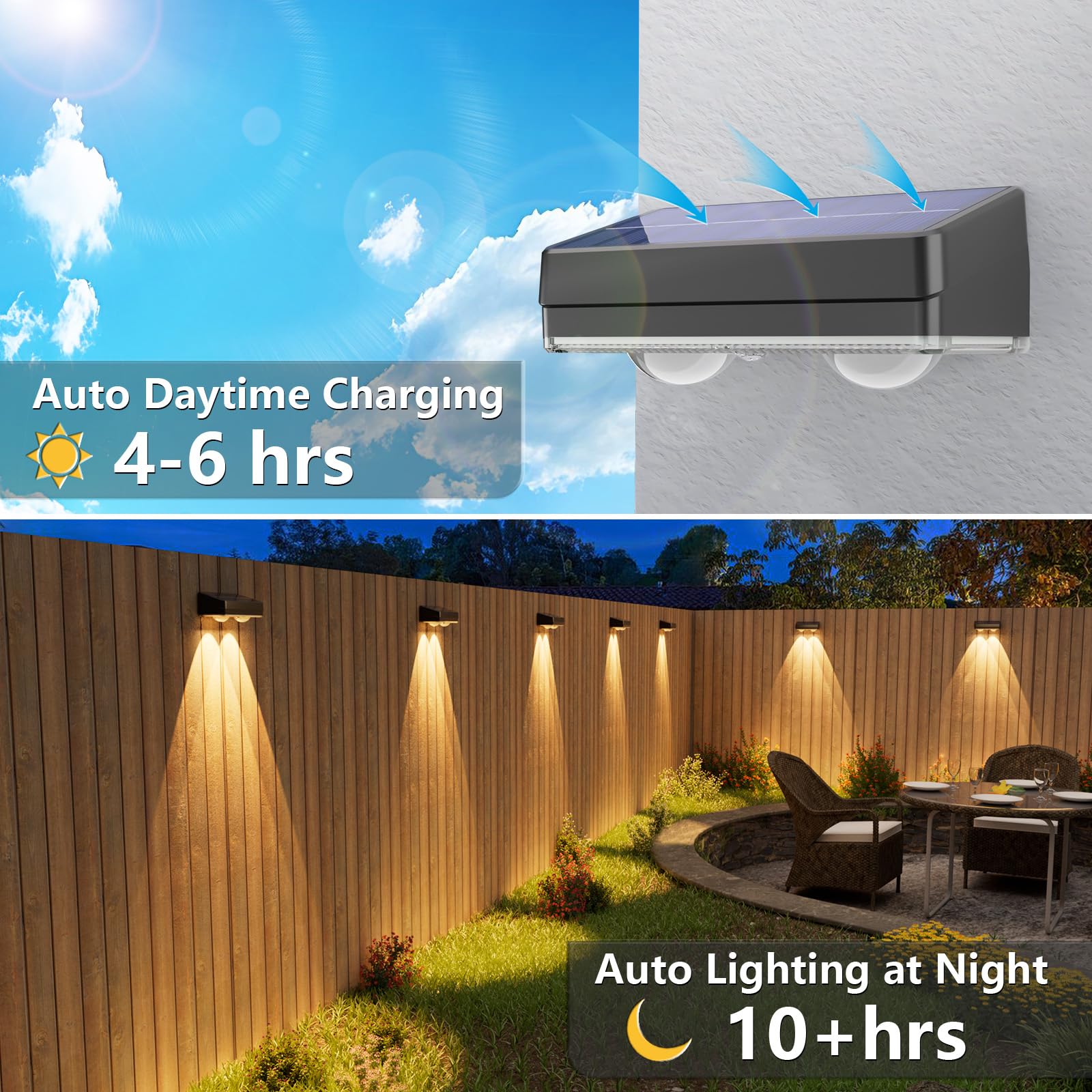 - 【Upgraded Super Bright Lens LED】The solar fence light use new upgraded brightness focusing LEDs to emit a more focused and intense beam of light to illuminate a wider area. Solar powered fence lights are extremely bright, perfect for creating ambiance and providing ample illumination for backyards, patios, decks, patios, garages, gardens, steps, walkways, stairs and more