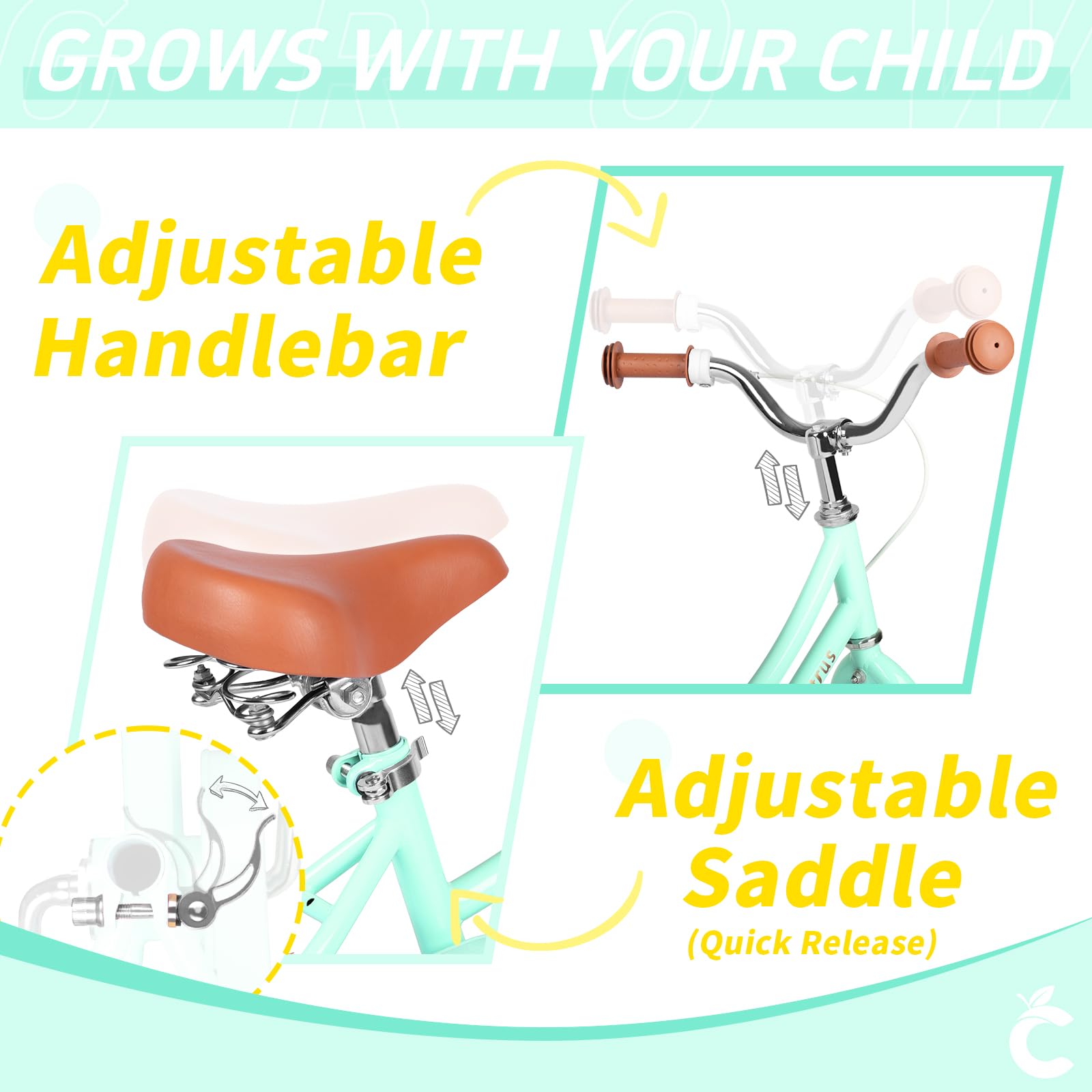 - Kids-Focused Design: Vollsch kids road bike boasts a distinctive frame crafted specifically for toddlers, balancing aesthetics with their unique body dimensions. It ensures a secure and enjoyable ride, thanks to its well-thought-out features like short brake levers, a low entry height, a protected chain guard, and detachable training wheels. Plus, the adjustable seat and handlebars grow with your child