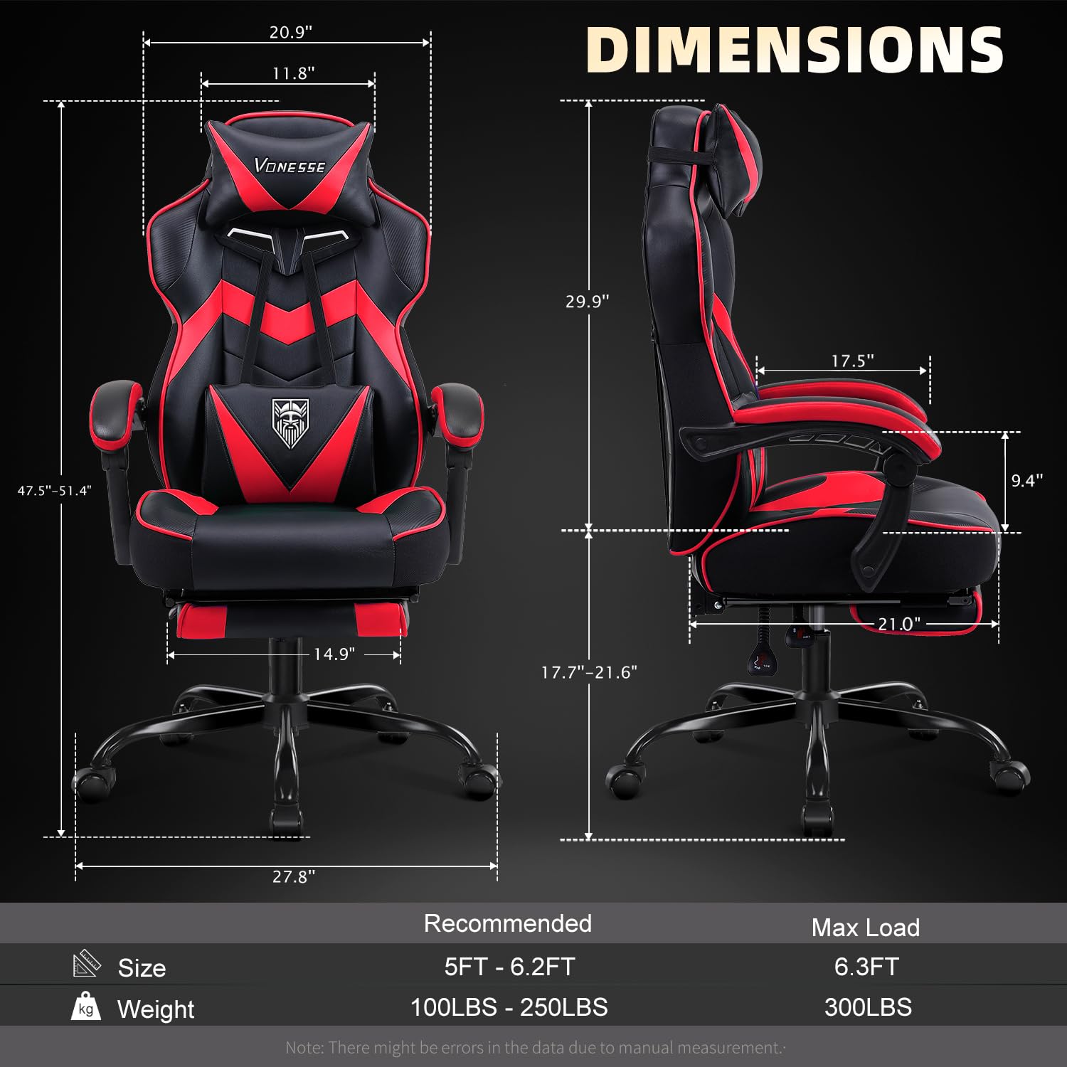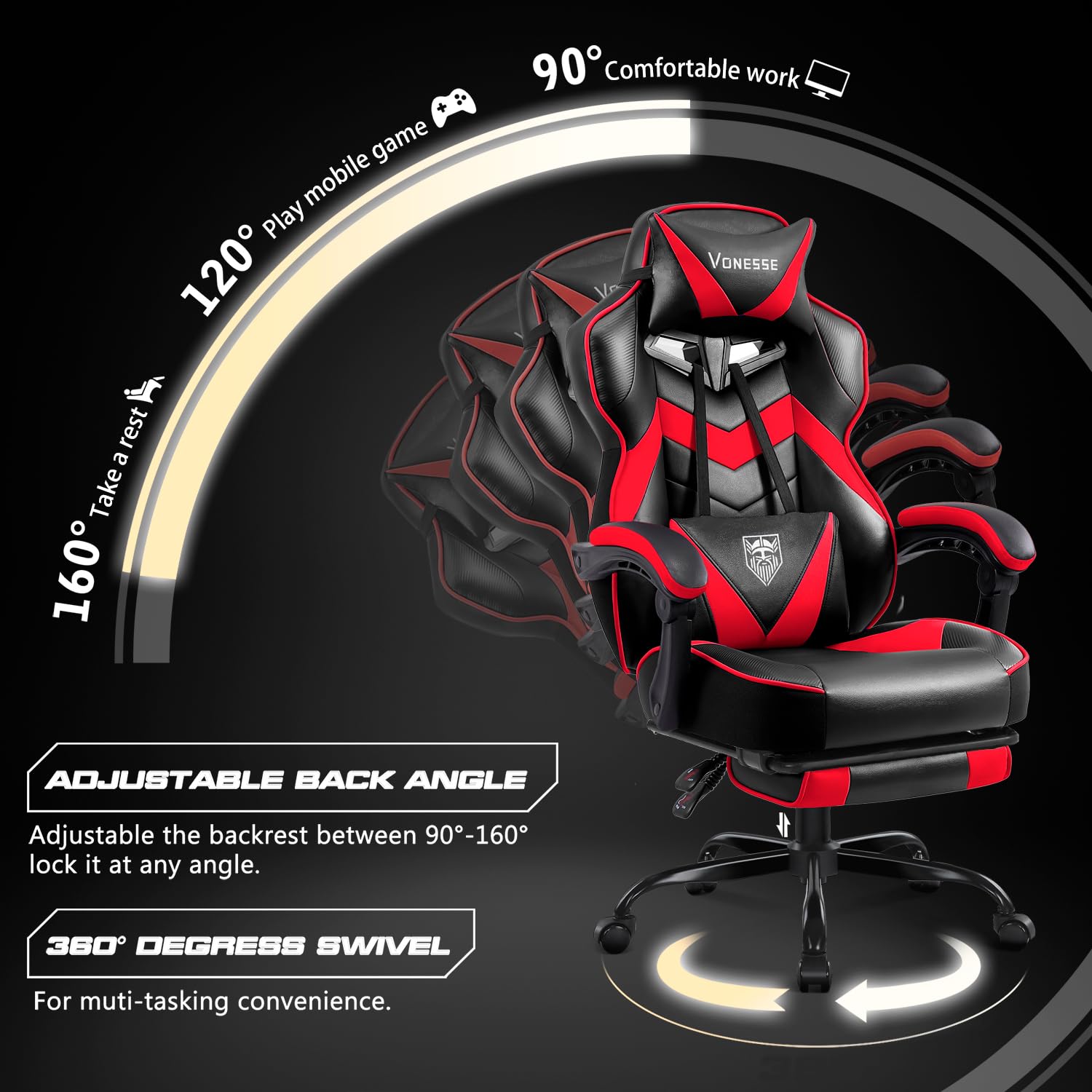 Vonesse Gaming Chair,Computer Chair with Footrest and Massage,Reclining Gaming Chairs for Adults,Big and Tall High Back Gamer Chair (Red/Black)