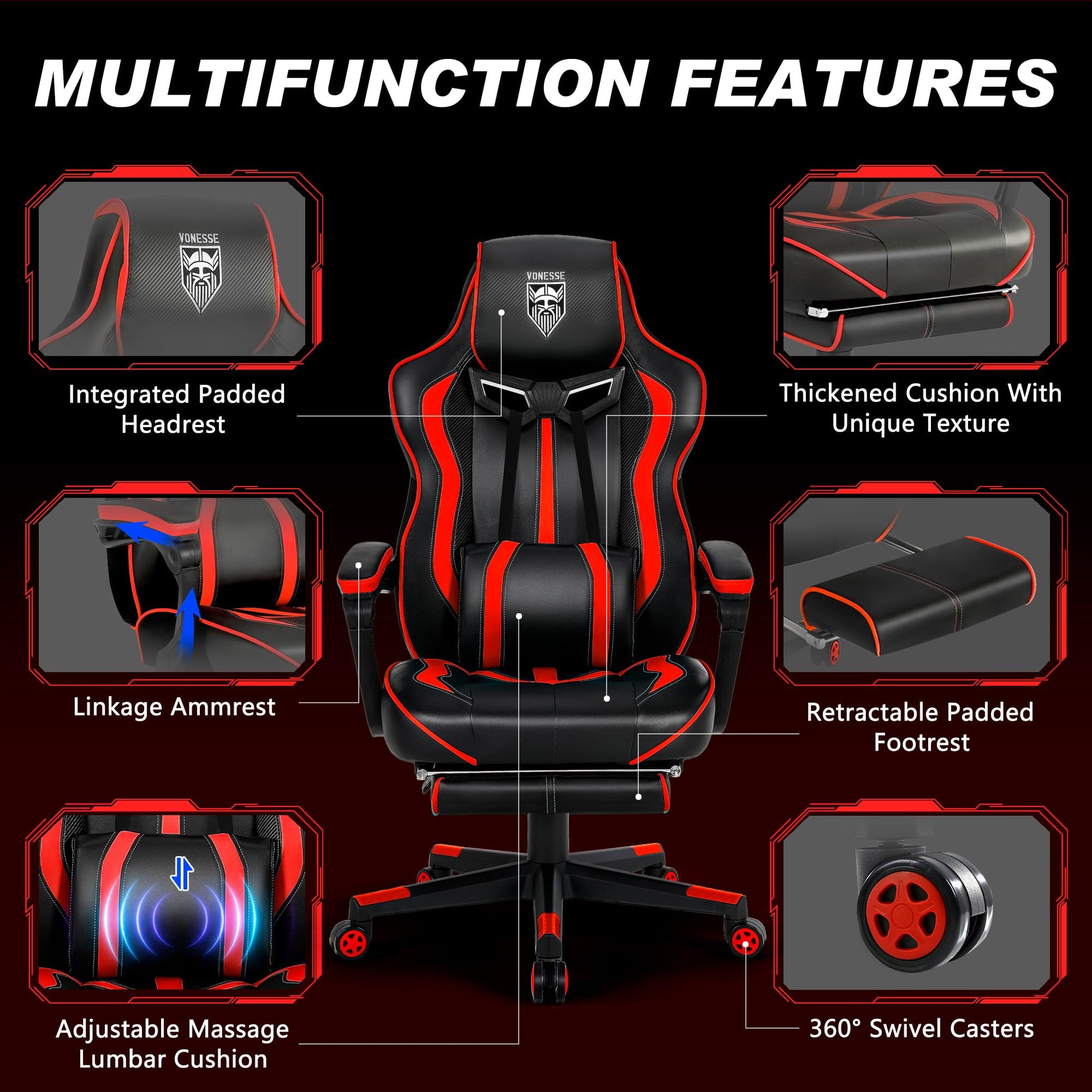 Vonesse Reclining Gaming Chair with Footrest Gaming Computer Chair with Massage Recliner Computer Chair Big and Tall Gaming Chairs for Adults(Red/Black)