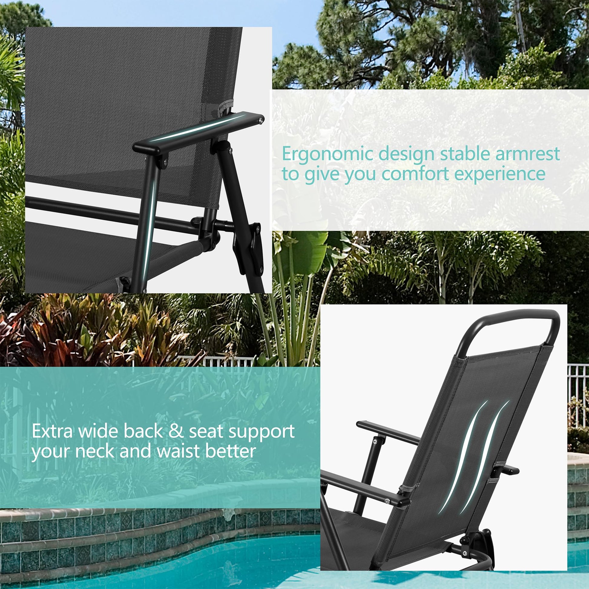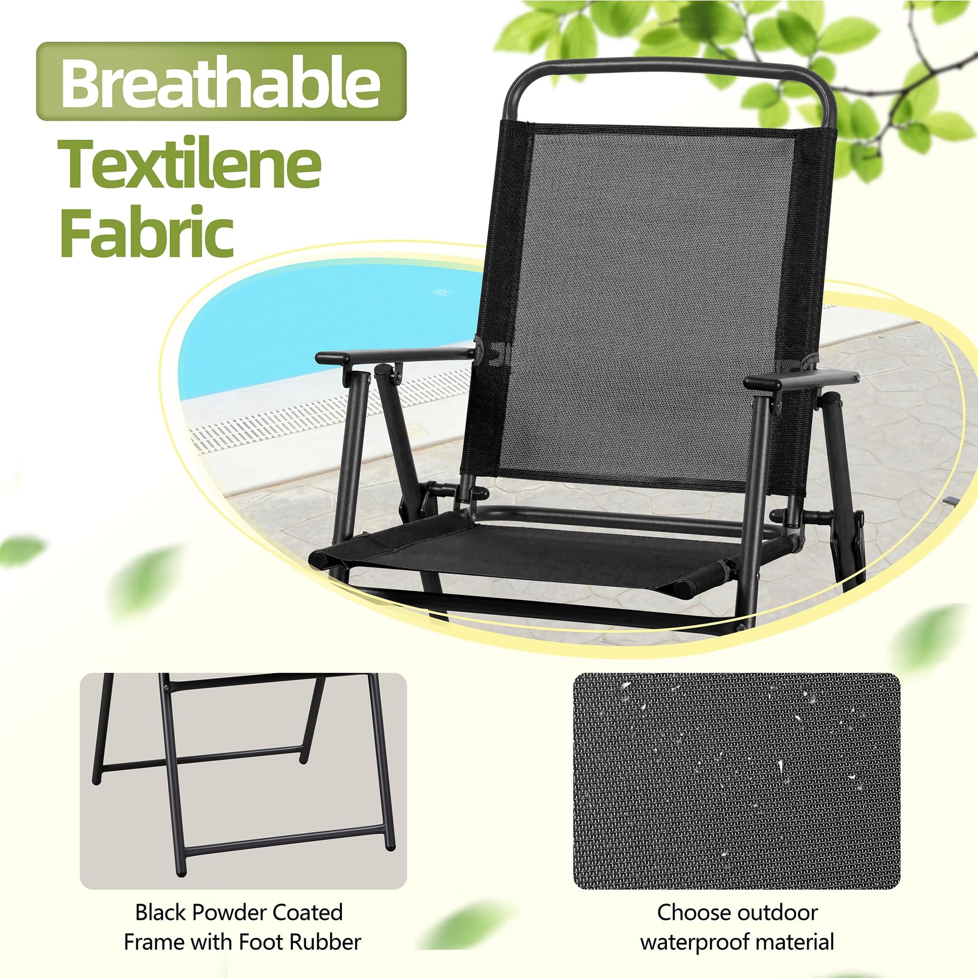 - [Sturdy& Durable Material] Made of powder-coated steel, the chairs and table are weather and rust proof for long lasting use; Featuring a sling Textilene fabric, the 4 folding chairs are breathable, sweat absorption and flash drying