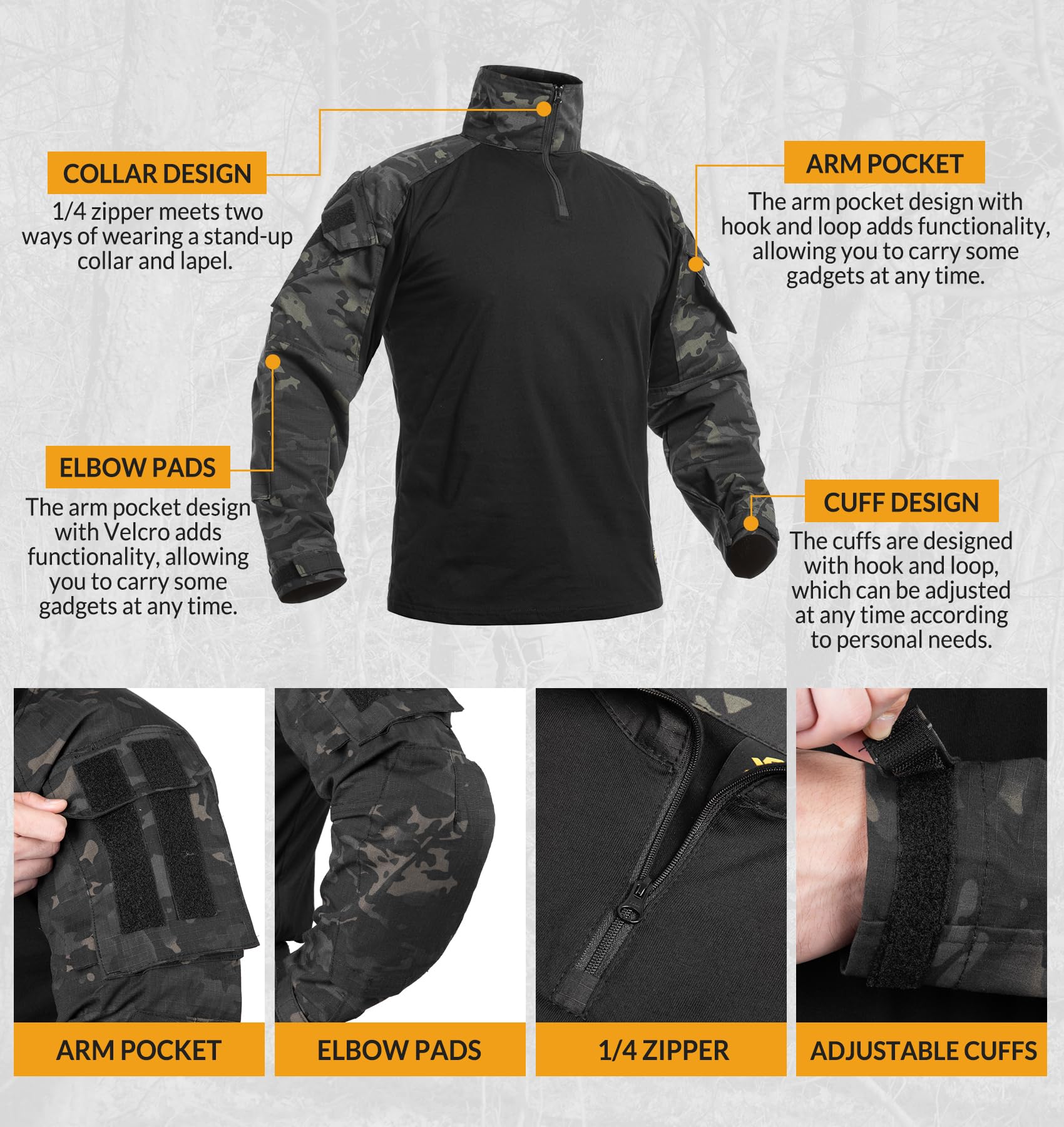 - High-Quality Material: Crafted from a blend of 50% cotton and 50% polyester fabric, our tactical combat uniforms boast exceptional tear resistance and elasticity. The premium YKK zipper ensures a smooth and snag-free experience. Experience lasting comfort and durability.