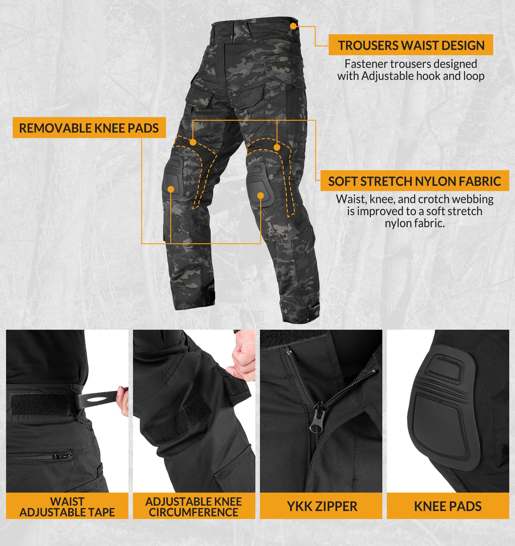 - Complete Package: Your purchase includes a pair of tactical pants with knee pads and a G3 tactical combat shirt with elbow pads. Choose from a selection of colors, including Camo, Dark Black, and Black.