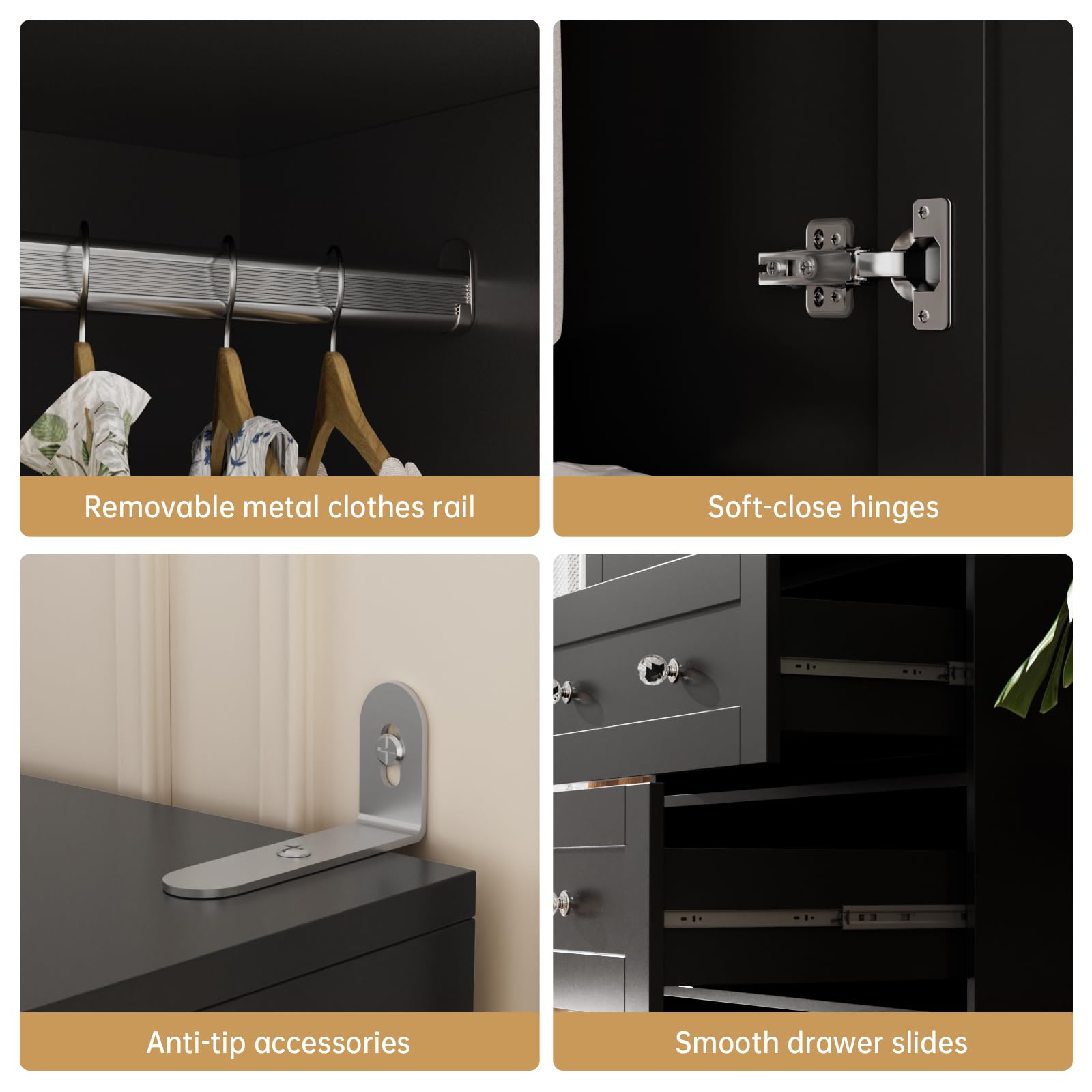 - Fashion Wardrobe with Mirror: Our wardrobe closet comes with large mirror and crystal knobs, allowing you to have a full view of yourself and add an elegant & noble charm to your bedroom.