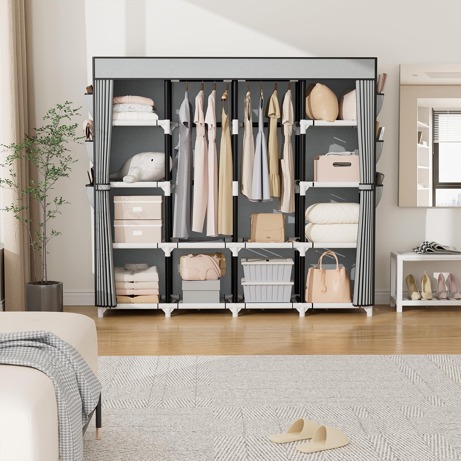 VTRIN Portable Closet, 69 Inch Wide Wardrobe Closet for Hanging Clothes, 19mm Metal Pipe,Sturdy Clothes Rack with Cover, 2 Hanging Rod,12 Shelves, 6 Pocket, Free Standing Closet for Bedroom