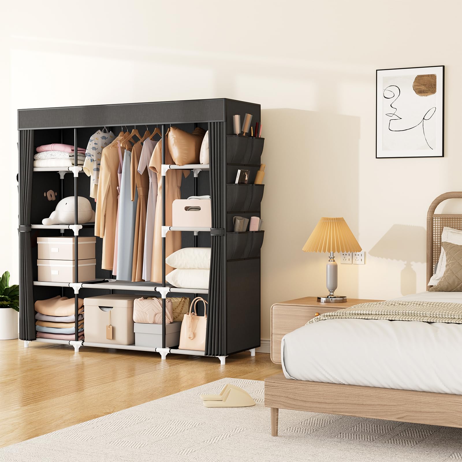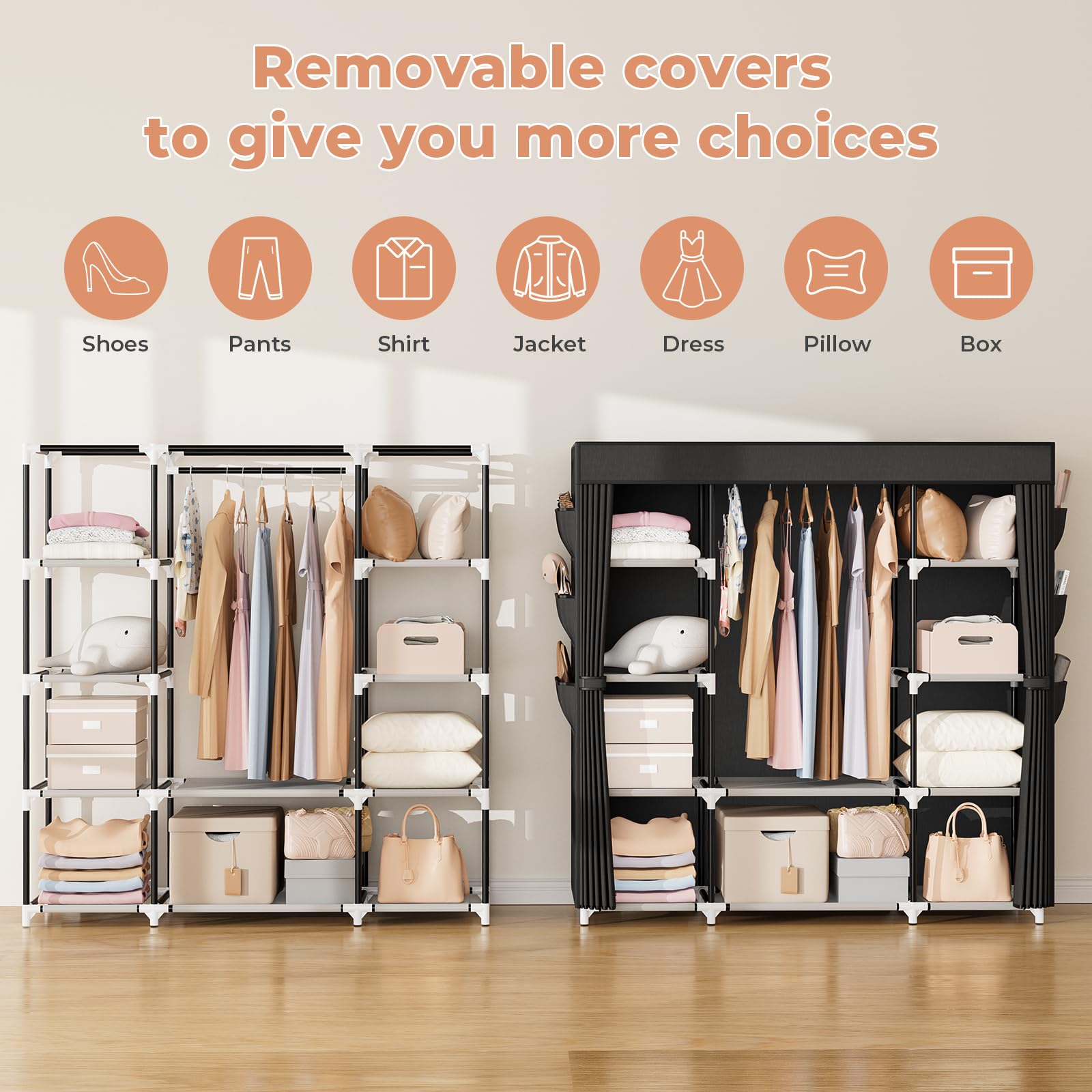 VTRIN Portable Closet Wardrobe for Hanging Clothes 57.3 Inch Large Capacity Clothes Rack with Cover, 10 Storage Organizer Shelves, 1 Hanging Rods and 6 Pockets, Free Standing Closet for Bedroom, Black