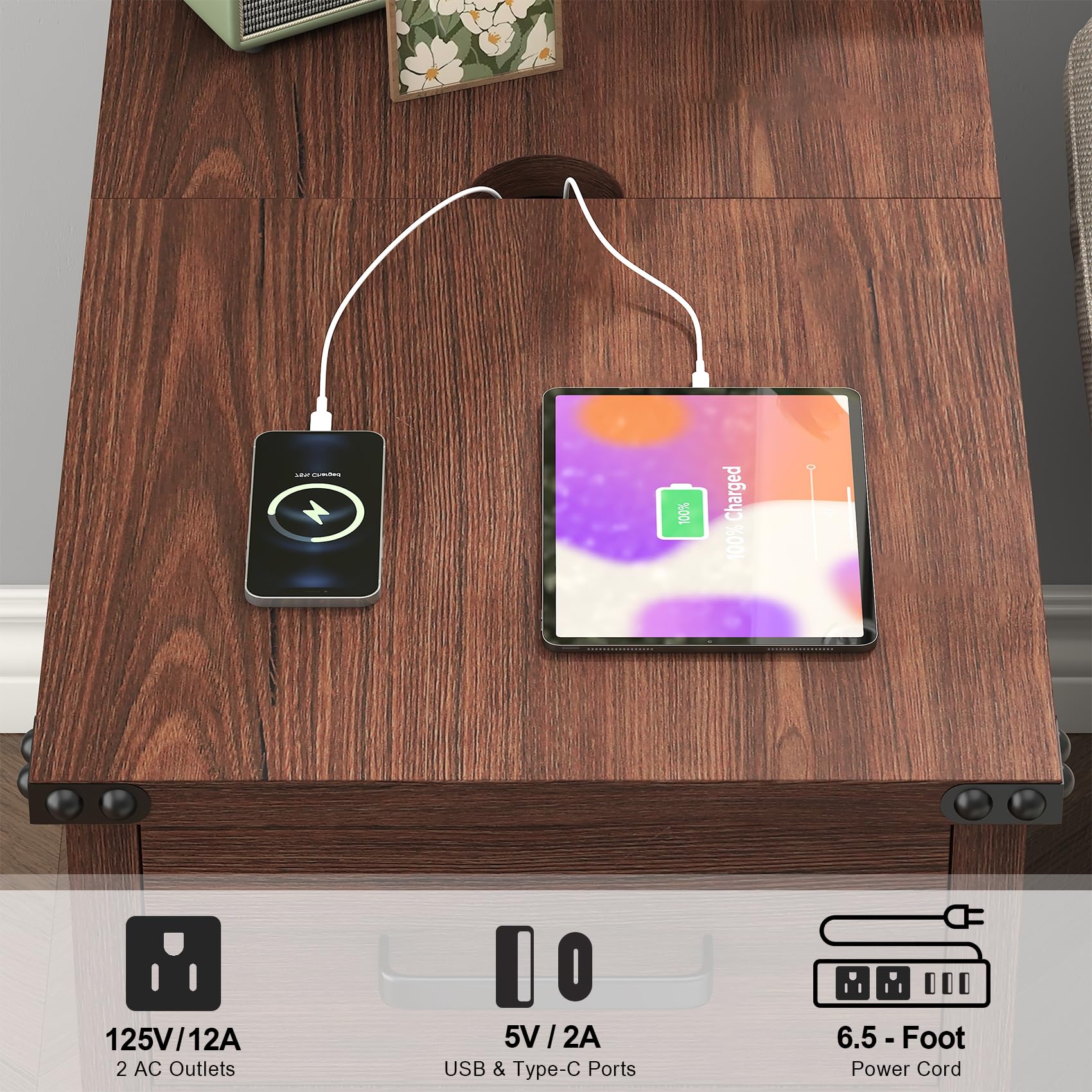 VVFLU Farmhouse End Table with Charging Station and 1 Storage Cabinet, 1 Drawer, Cherry Wood Nightstand Narrow, Skinny Side Table, Slim Bedside Table, Small Nightstand for Bedroom, Living Room, Sofa