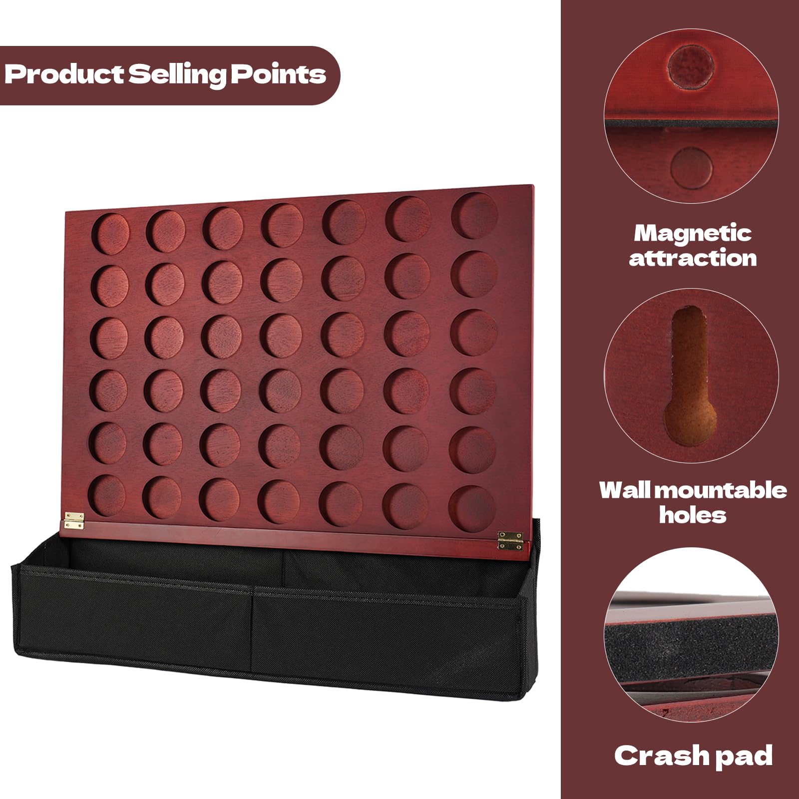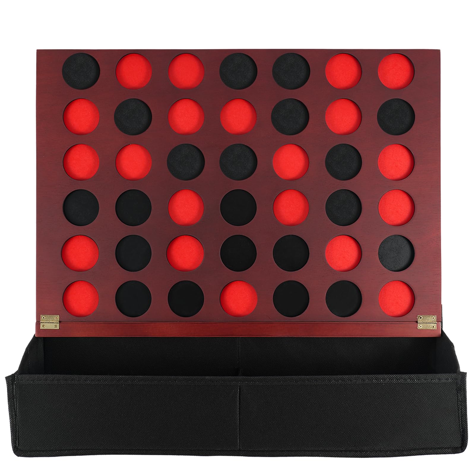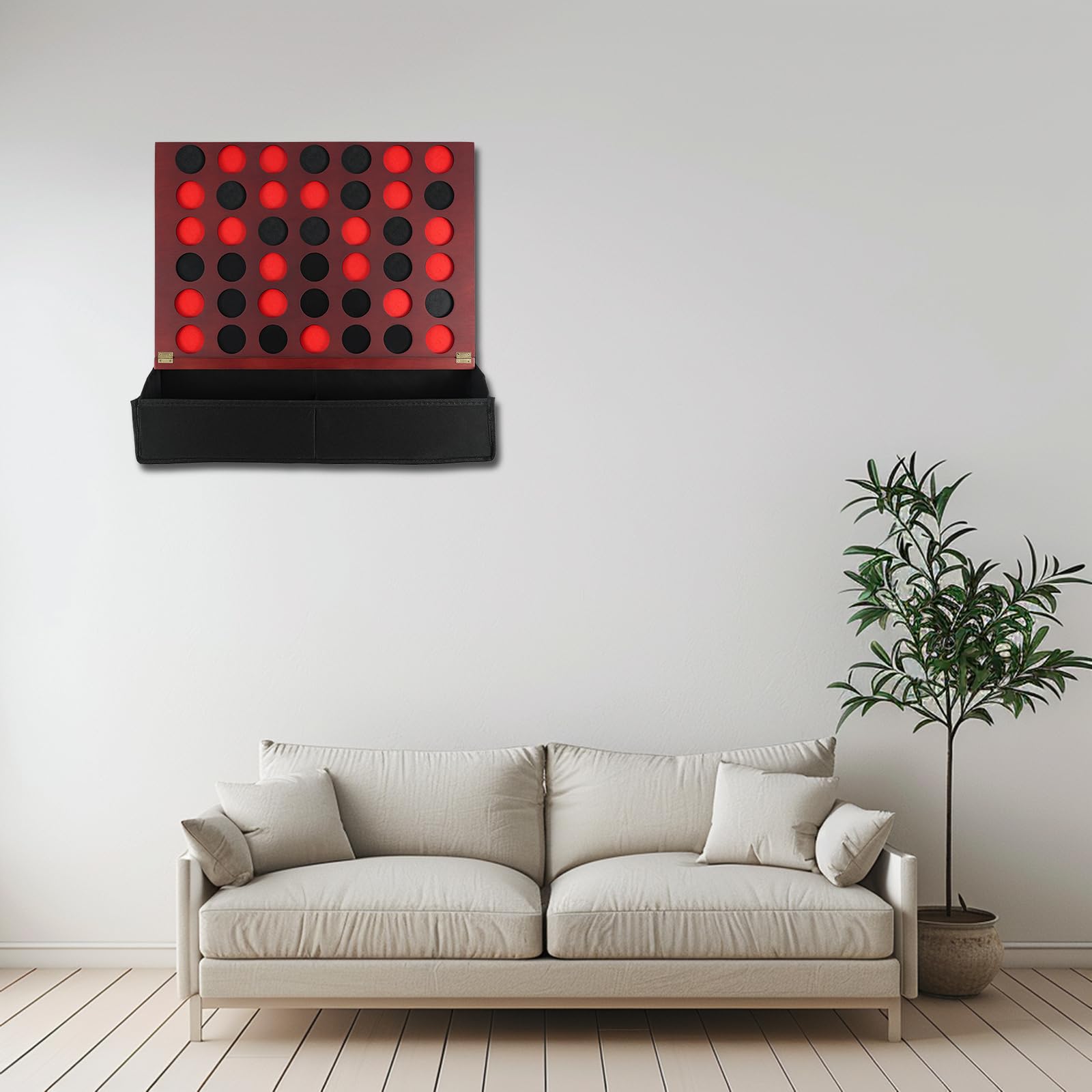 - 【Wooden Giant 4 In A Row】This game product is made of sturdy and durable wood, and printed with vintage colors. Its size is 22.44 * 15.75 * 0.59 inches, and the product includes a wooden four piece chess board, a chess piece storage box, a black base storage bag, and 42 game coins (21 red and 21 black). The game pieces are made of wood and can be played many times without being easily damaged. We also come with a material pack, so you can hang this game on the wall according to the instructions.
