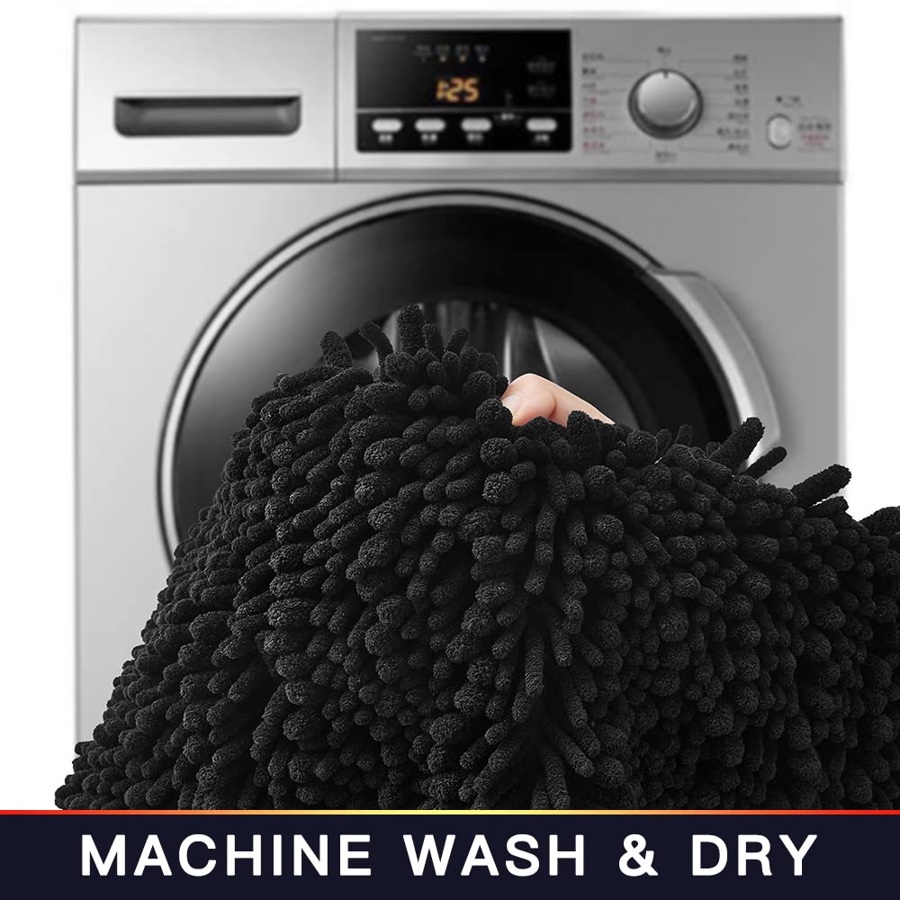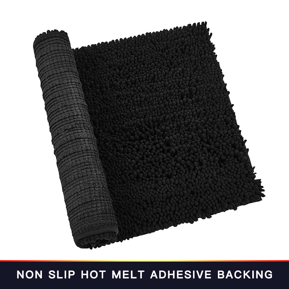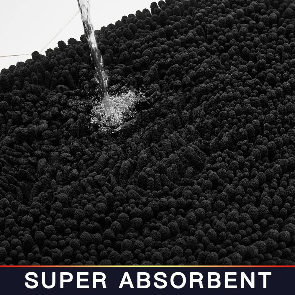 Walensee Bathroom Rug Non Slip Bath Mat (24x17 Inch Black) Water Absorbent Super Soft Shaggy Chenille Machine Washable Dry Extra Thick Perfect Absorbant Best Small Plush Carpet for Shower Floor