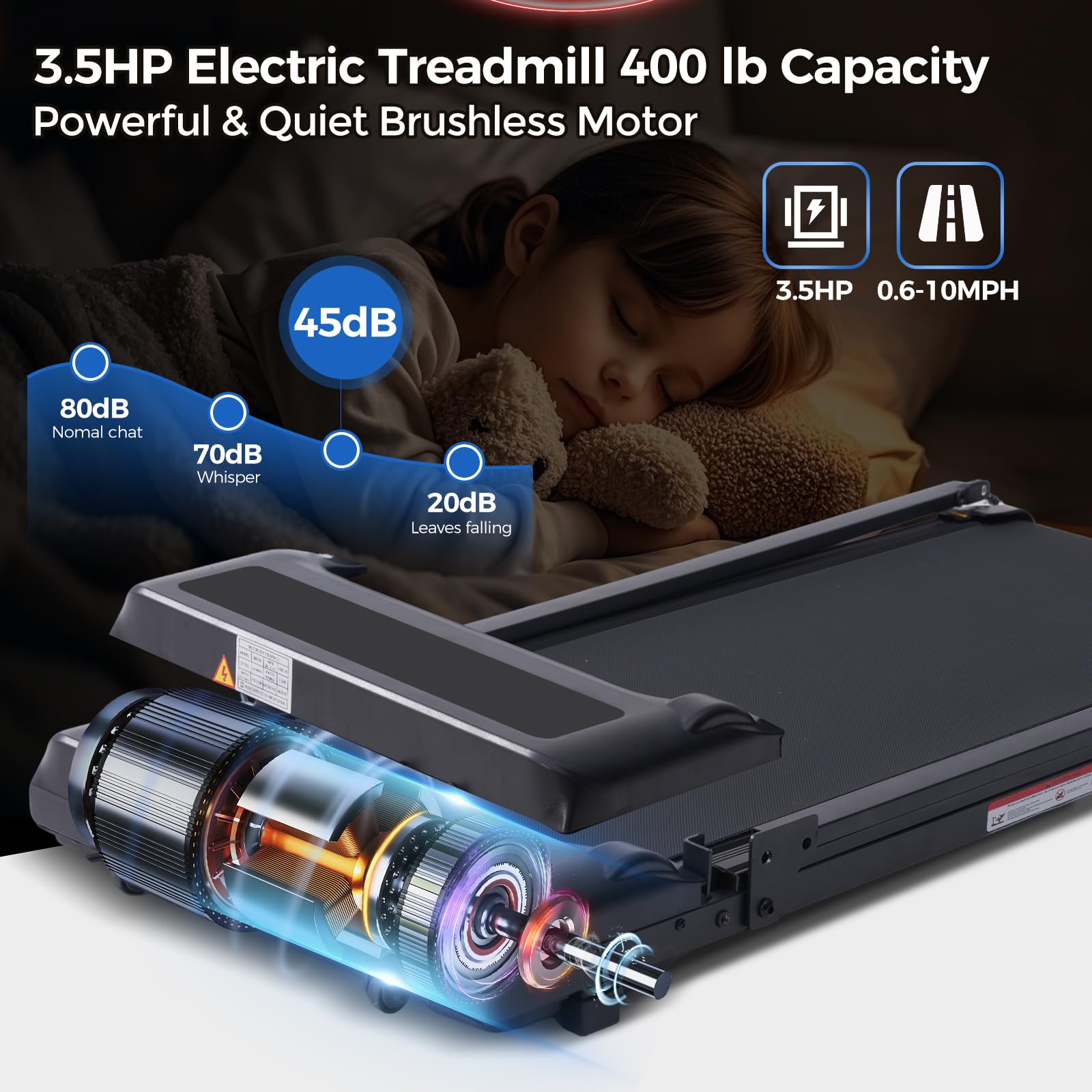 - 【Powerful 3.5HP Motor and High Weight Capacity】 Featuring a powerful 3.5HP brushless motor, this portable treadmill reaches speeds up to 10 mph while maintaining ultra-quiet performance under 45dB. Its 6-layer shock-absorbing belt protects joints and supports up to 400 lbs, making it ideal for those needing a compact treadmill for home use with high capacity
