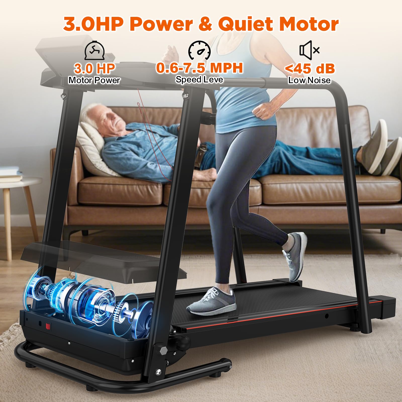 - Quiet Power for All Fitness Levels:Powered by a 3.0 HP motor, this treadmill delivers smooth, stable performance at 0.5–7.5 MPH—ideal for seniors walking, young adults jogging, or interval training. The quiet operation (65dB max) won’t disturb family or neighbors, making it perfect for apartments, home gyms, or offices. Use the heart rate monitoring feature (via built-in sensors or Bluetooth chest strap, sold separately) to stay within your target zone and optimize calorie burn.