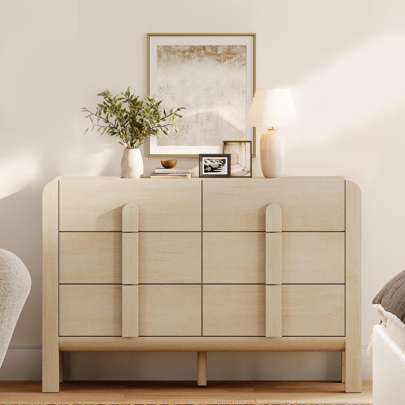 - Elegant Curves & Unique Arc-Shaped Handles – Blending Mid-Century Modern dresser elegance with light oak dresser charm,Designed for both safety and style, this wood dresser is built with smooth, rounded edges that help prevent bumps—especially great for homes with children.The solid wood arc-shaped handles add a soft, natural feel that’s easy to grip while visually enhancing the piece.