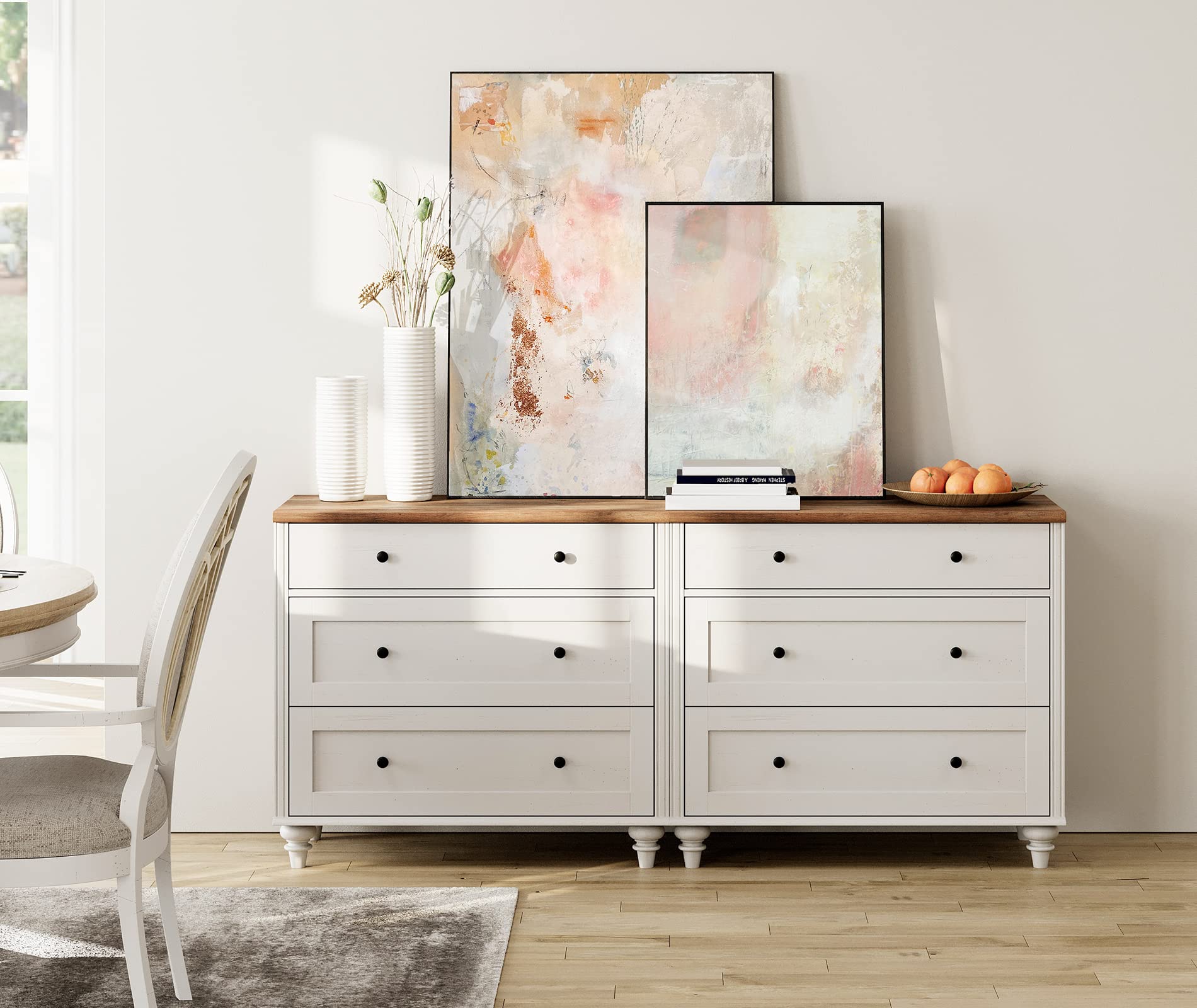 - 【2-in-1 Multipurpose Dresser】The 2-in-1 large dresser can be used together as 6 drawer dresser or tv stand for 75 inch tv, or used separately as two 3 drawer dressers.With distresser suface is very classic and elegant which blends in easily with any decor. It is ideal as a baby dresser, kids dresser and console table, etc.