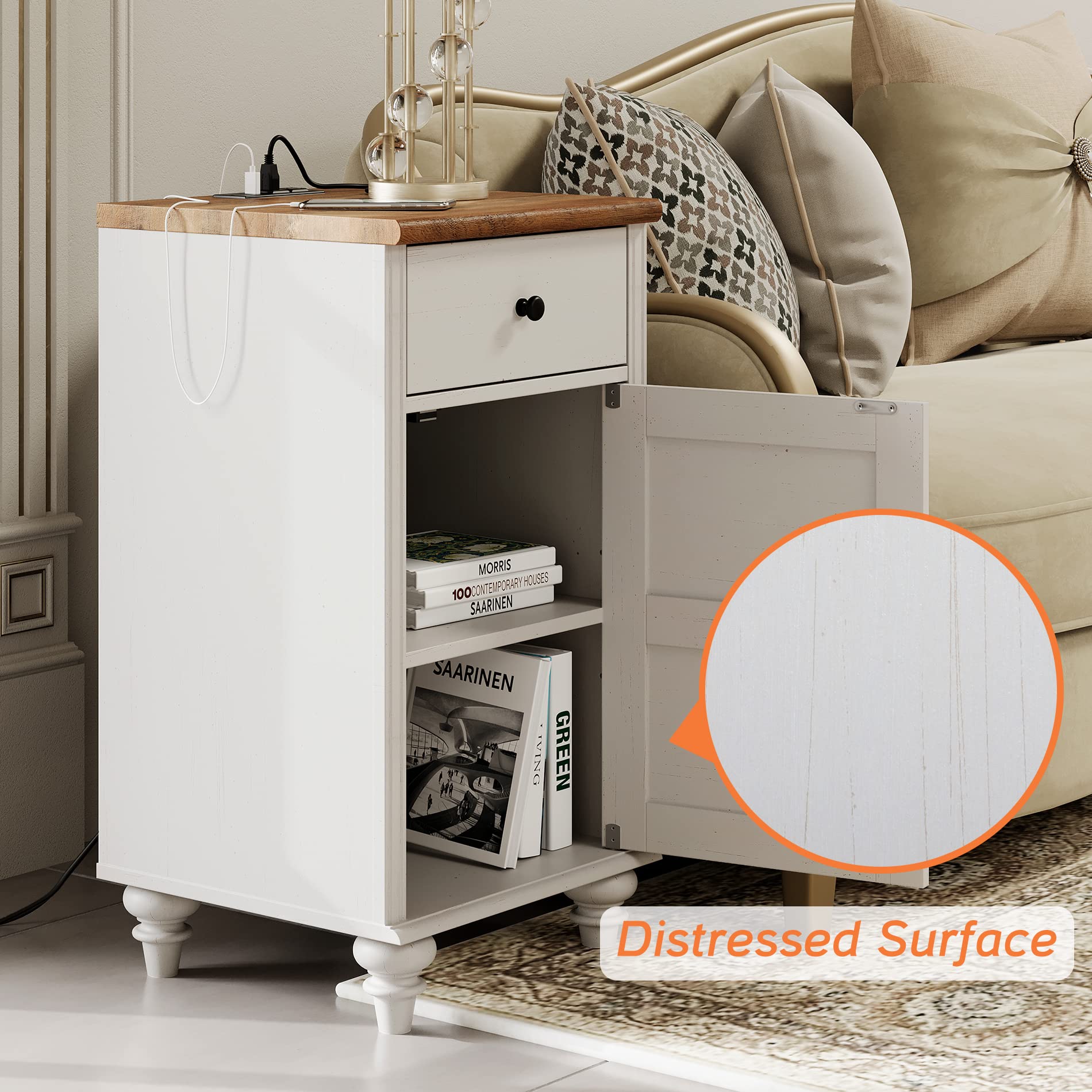 WAMPAT Set of 2 End Table with Charging Station, Wood Nightstands with Drawer and Storage Cabinet, Modern Side Tables Living Room Set of 2, Farmhouse Night Stands Bedside Table for Bedroom, White