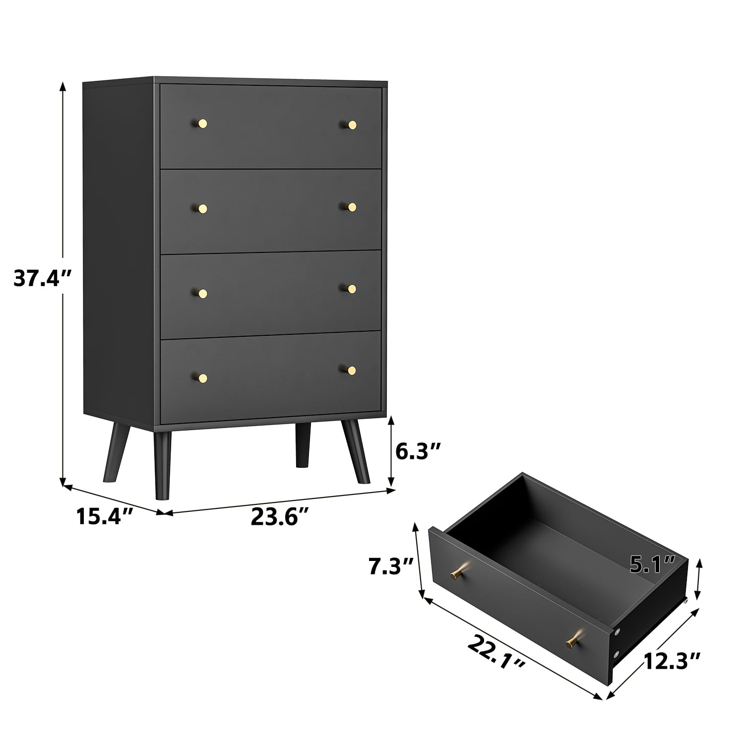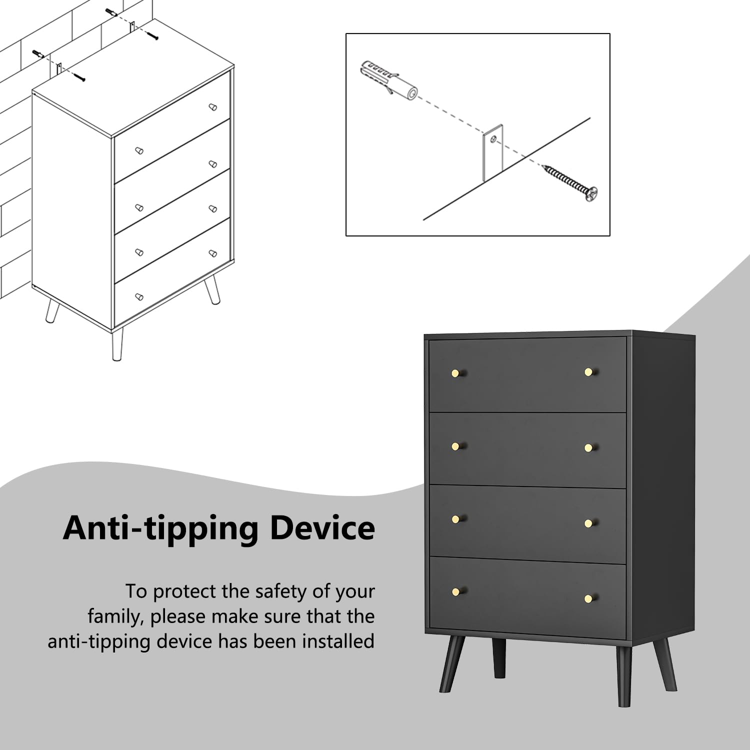 Details: 4 Drawer Black Dresser for Bedroom Features: - 4 Deep Drawers: Ample space for daily storage - Anti-tipping Device: Prevent your kids or pets from incident - Gold Handles: Create a clean and spacious look in your bedroom or living room - Wide Tabletop: Offers a decent place for your daily stuff Specifications: - Color: Black - Material: Engineered Wood - Overall Dimension: 23.6" L x 15.7" D x 37.4" H - Weight Capacity: 33 lbs each drawer Package Includes: - 1x 4 Drawer Dresser - 1x Instructions - 1x Accessories Bag