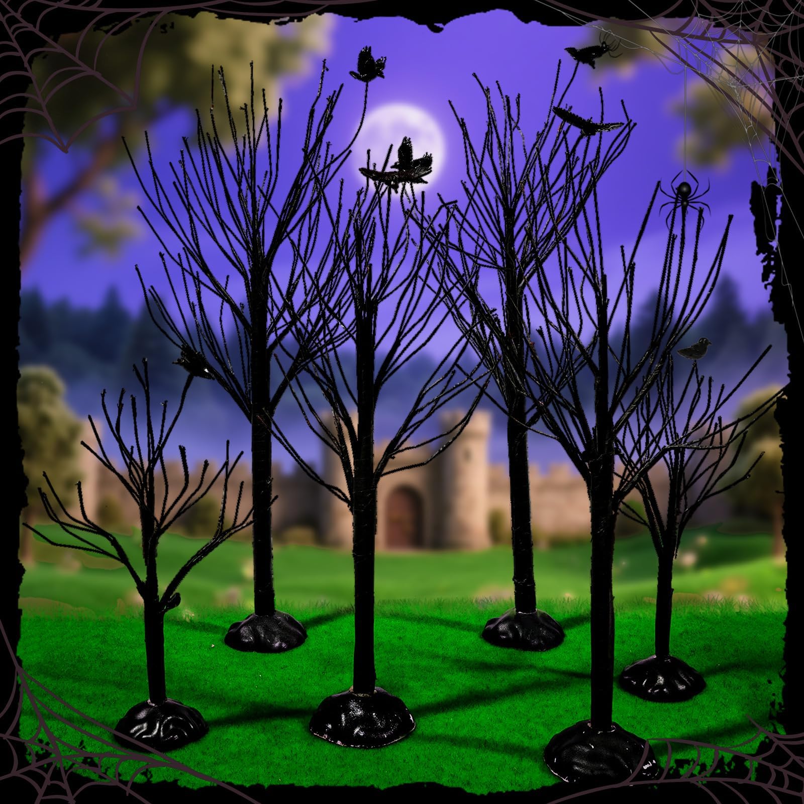 6 Pcs x Mini Decor Trees Village Accessories Mini Tree Color: Black Material: Plastic, Resin Creative Handicraft: The foldable bare branch tree is reinforced when unfolded, and can be bent and shaped as desired. The crow has holes at the bottom, which can be easily fixed with white latex, and the assembly is super convenient. Realistic simulation effect: The design with a strong Halloween atmosphere can instantly catch the eye and make the space attractive. Package includes: 6 Halloween village mini trees