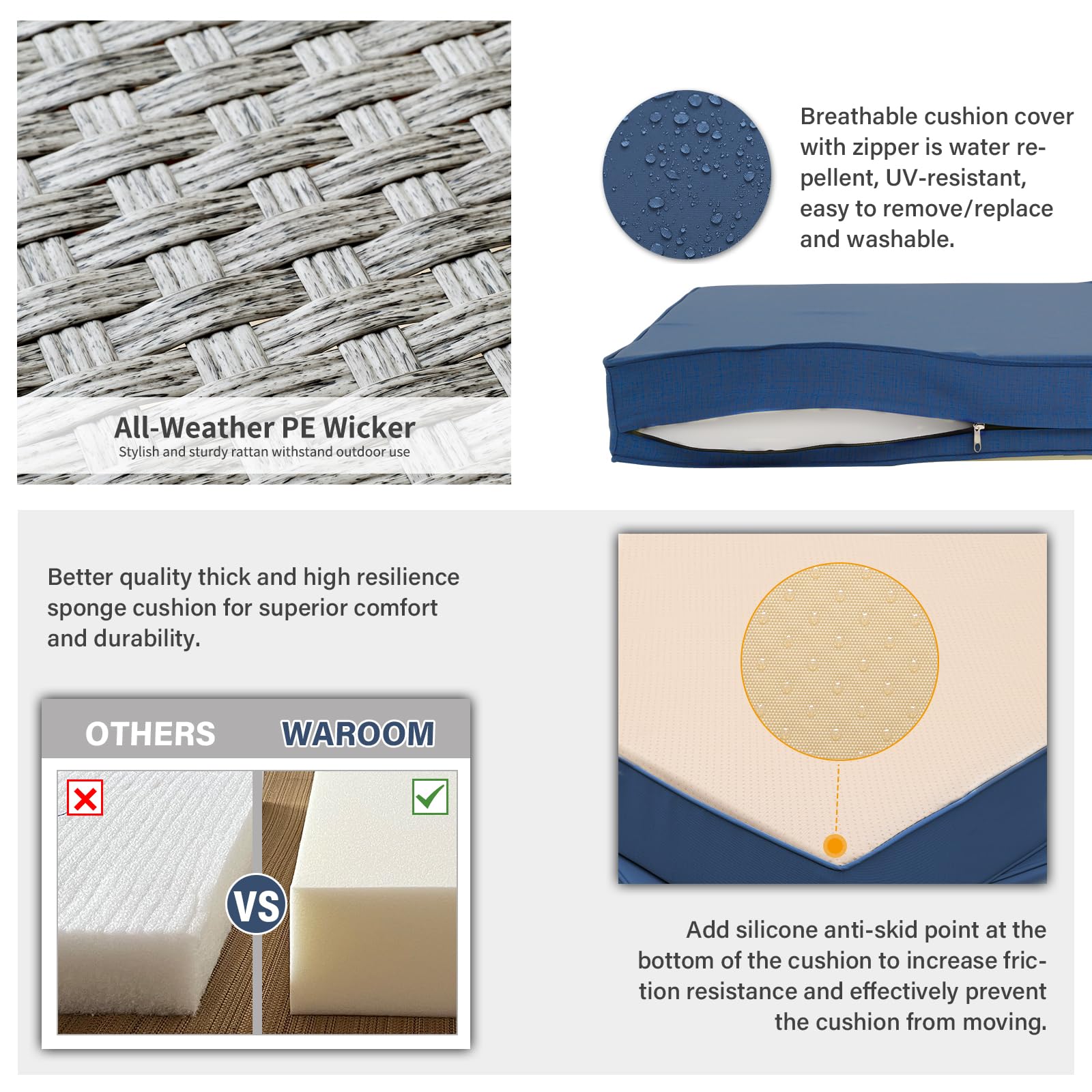 - Comfortable: The non-slip seat cushions are filled with a 4" thick high resilience sponge for superb comfort and relaxation, breathable cushion cover with zipper is wear-resistant, water-repellent, UV-resistant, and high color fastness