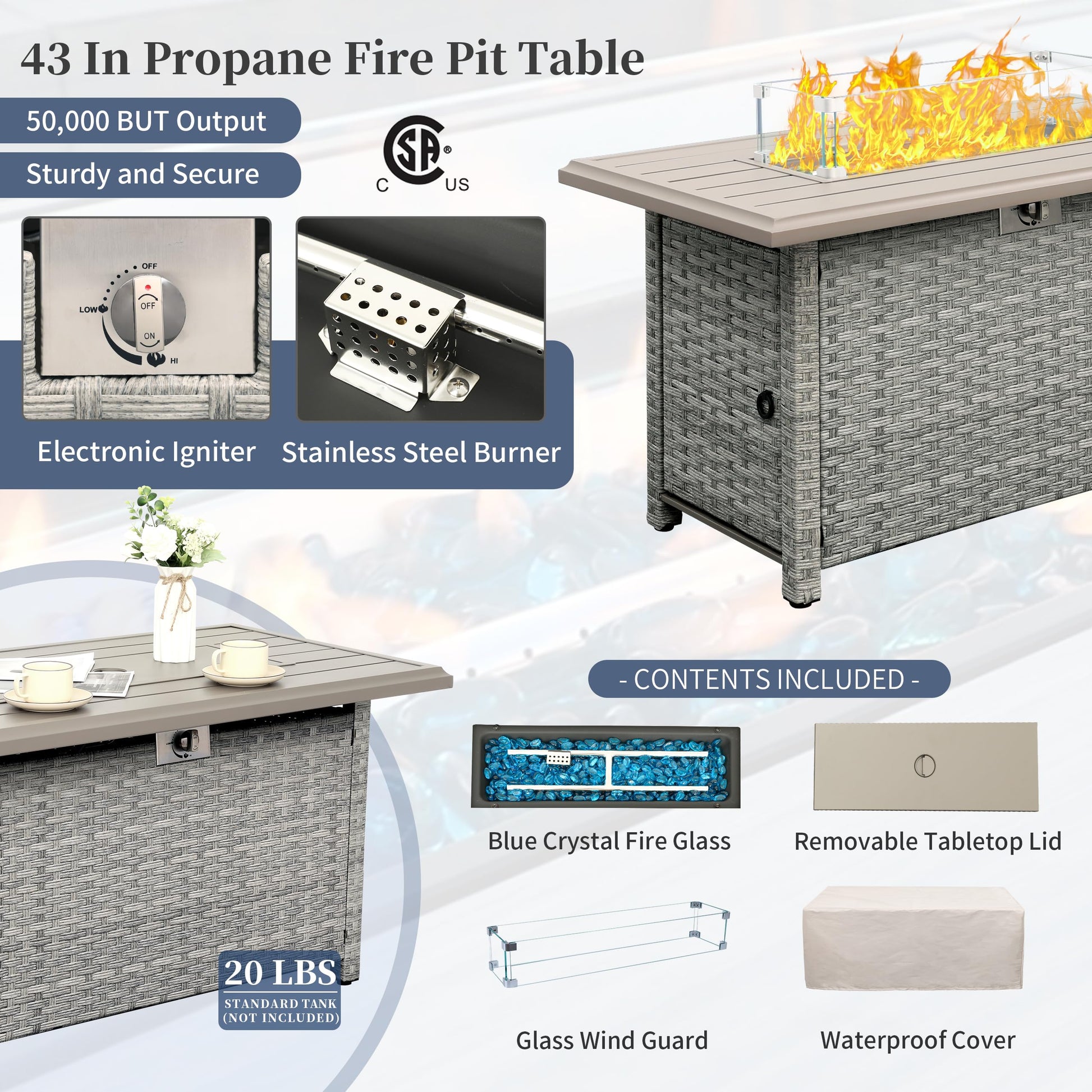 - 50,000 BTU Output: This patio fire pit table comes with a removable lid and can be used as a dinning table. Works with a standard 20 lb propane tank(not include). Includes glass wind guard and fire glass that is clean enough to make flames more fun
