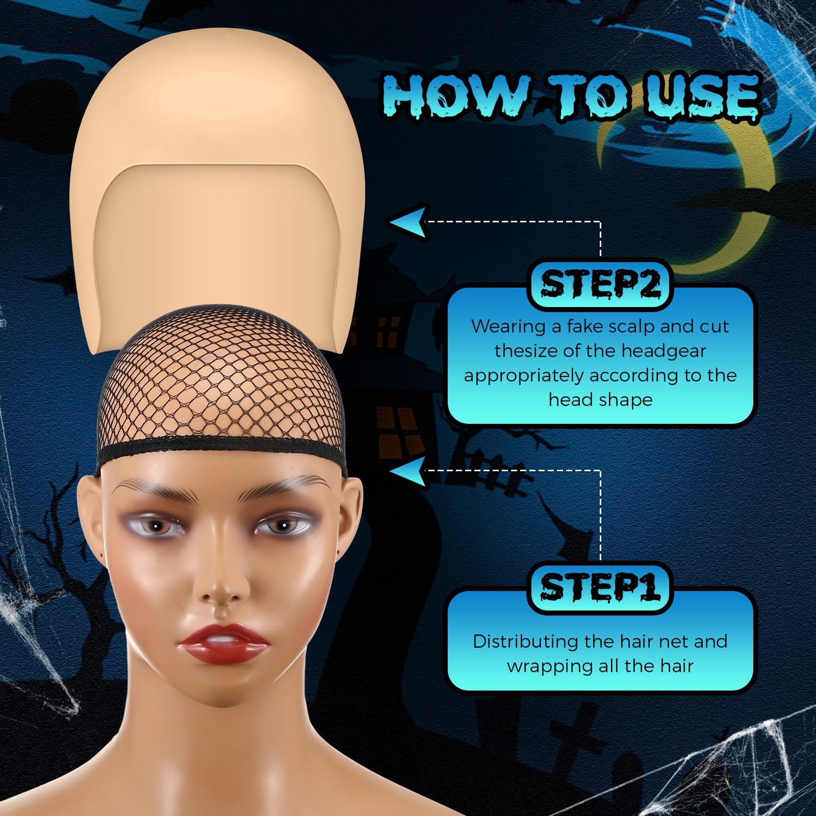 - Easy to Put into Use: to use these Halloween bald caps, simply use the mesh wig cap to fix your existing hair and then use the stretchable rubber latex cap to fit it on your head; You can apply liquid latex to the edge of the hat and paste it to your skin; Then use cosmetics to make it the same color as your skin