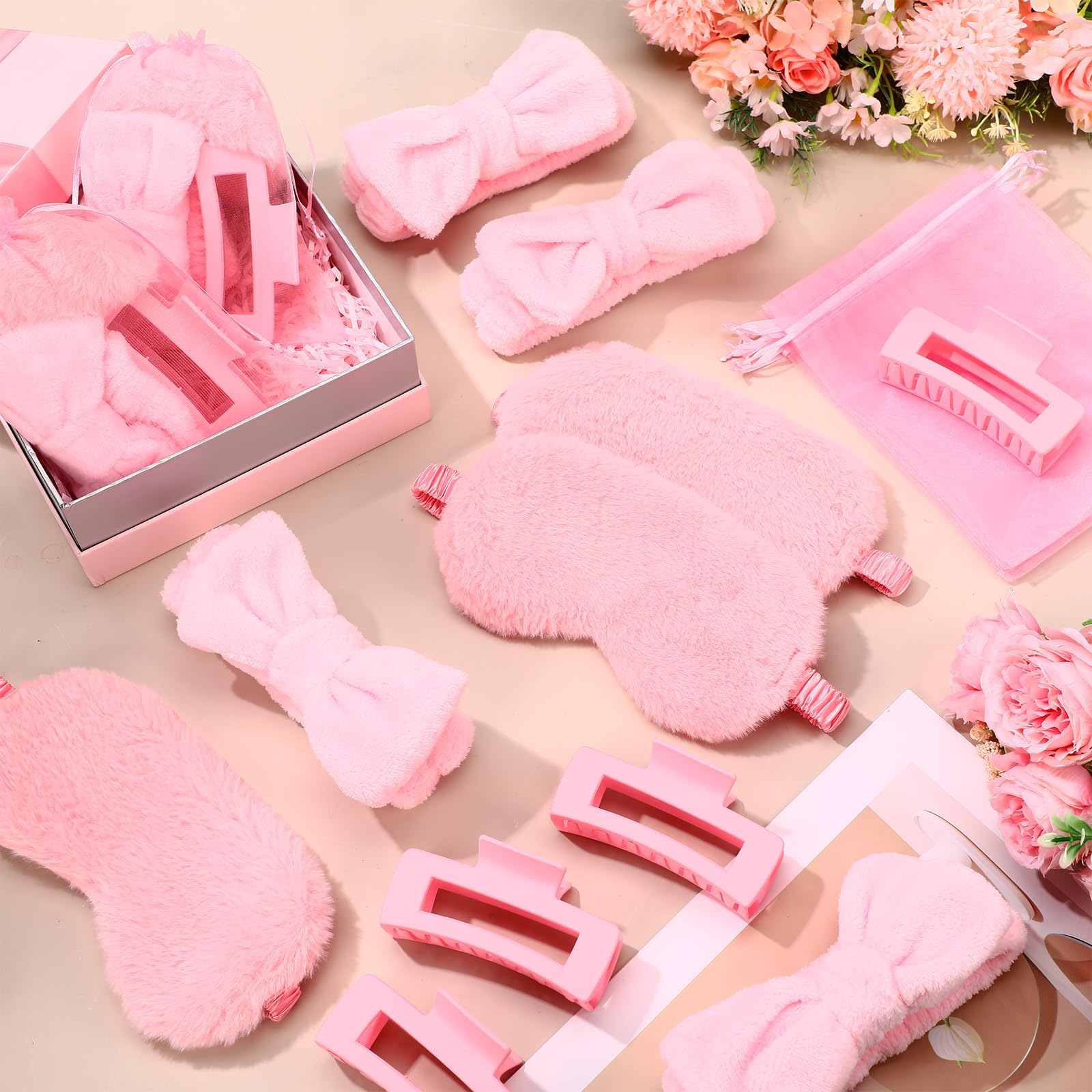 Wavyknot 48 Pcs Spa Party Supplies Sleep over Essentials 12 Pink Spa Headband 12 Pink Plush Sleep Eye Mask 12 Claw Clips 12 Organza Bags for Slumber Party Gift