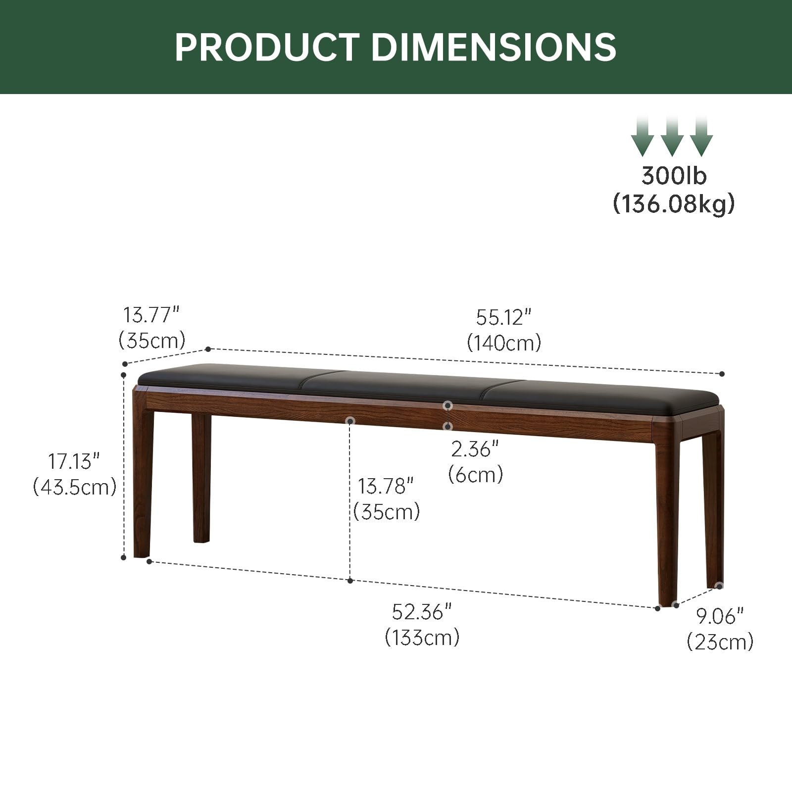 Wayshome 55.1'' Leather Upholstered Dining Bench with 100% Solid Oak Wood Bench Frame, 13.8'' Widened Padded Bed End Bench Ottoman for Kitchen Living Room Bedroom Entryway, Black
